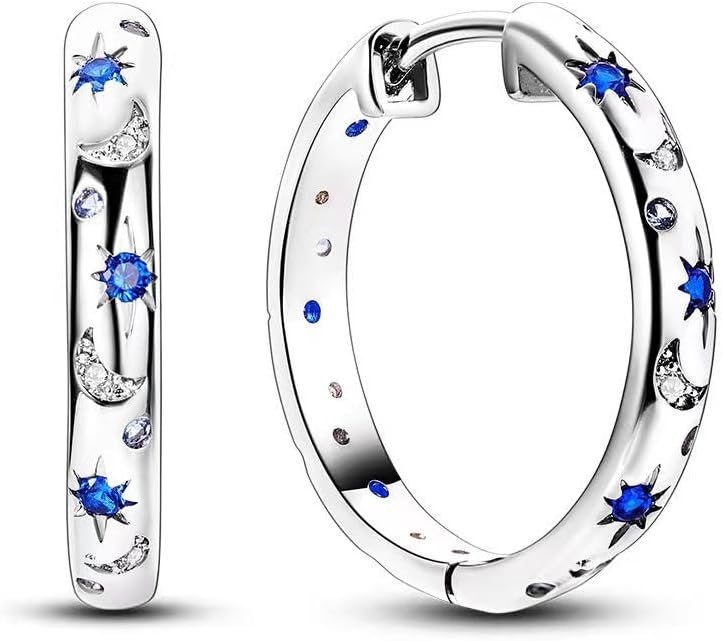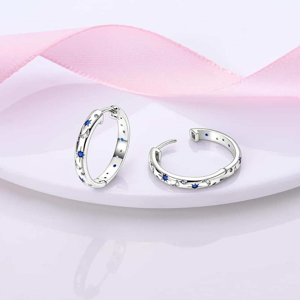 أقراط دائرية صغيرة تعتمد تصميم النجم والقمر، مثبتة على السطح بزركونيا مكعب متلألئ. تصميم بسيط ومميز يجعلها رقيقة ومشرقة.