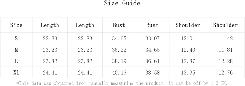 XL:Bust:38.6IN,Length:24.4IN,Shoulder:12.8IN