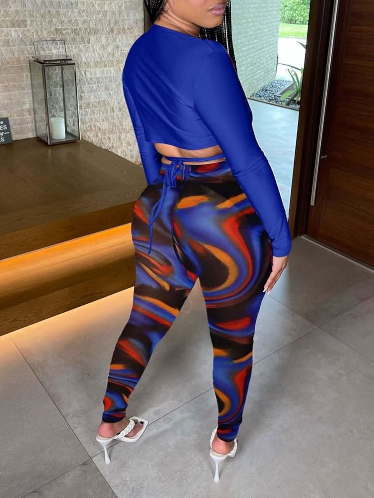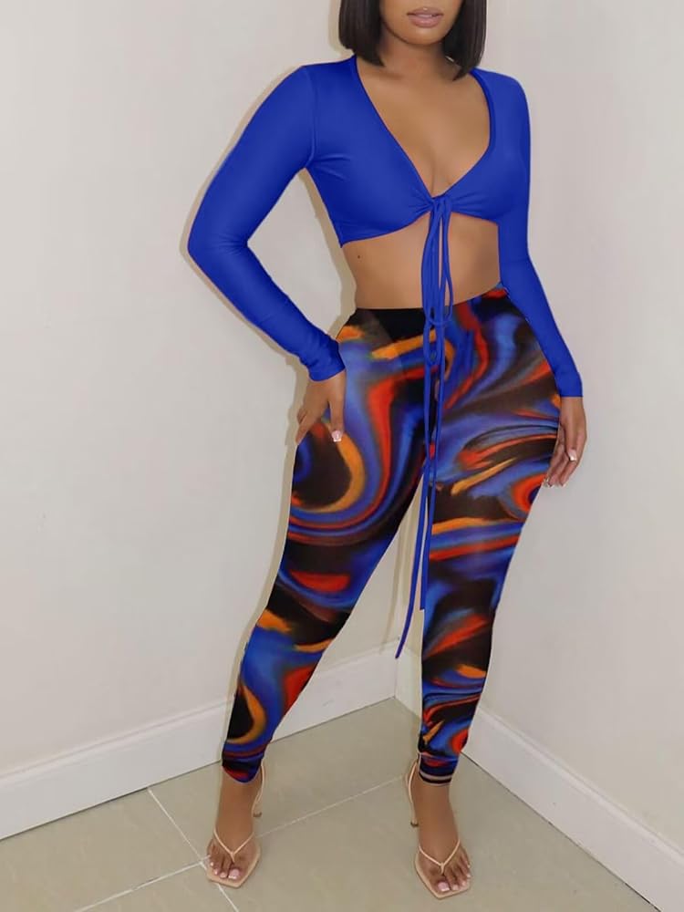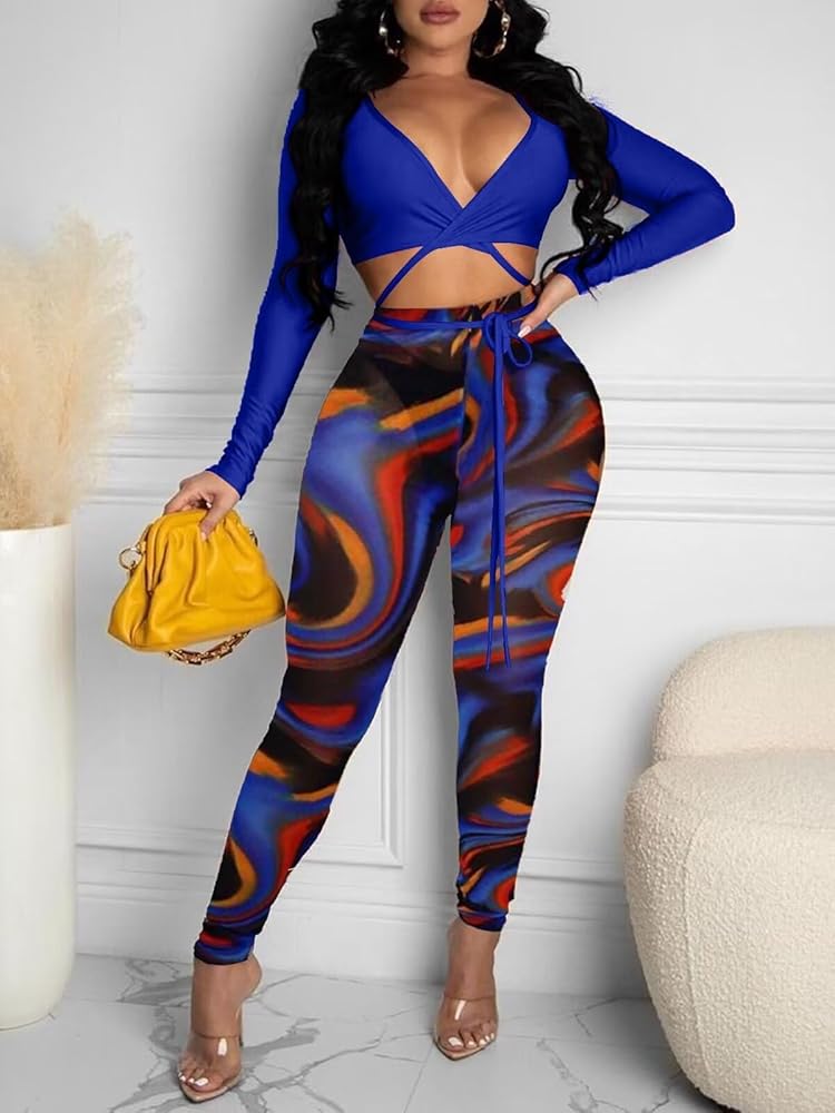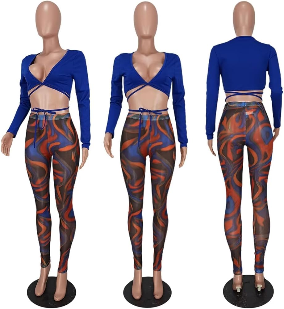 • المميزات: بذلة مثيرة مكونة من قطعتين للسيدات بأكمام طويلة، ورقبة متقاطعة، وسروال شبكي، ومقاس ضيق، وطباعة ملونة، وقميص بدون أكمام بلون ثابت.