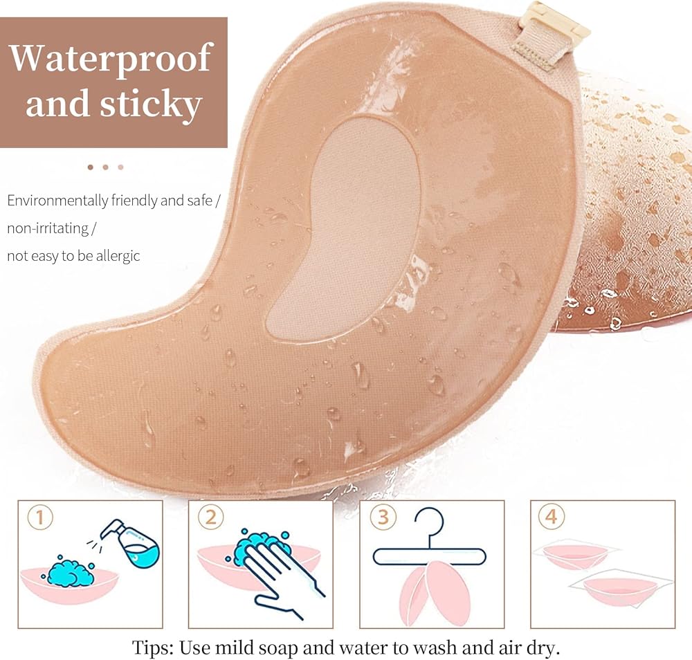 【قابل للغسل وإعادة الاستخدام】يُرجى الغسيل اليدوي بالماء الدافئ ومنظف صابون خفيف وتجفيفه بالهواء بشكل طبيعي، وتغطيته بطبقة واقية من البلاستيك (يرجى عدم غسله في الغسالة). يؤثر العرق الزائد على قوة التصاق حمالة الصدر، كما أن حمالات الصدر اللاصقة ليست مناسبة للأنشطة الخارجية في درجات الحرارة المرتفعة. ملاحظة: بعد التنظيف، تحتاجين إلى حماية طبقة هلام السيليكا بطبقة بلاستيكية.