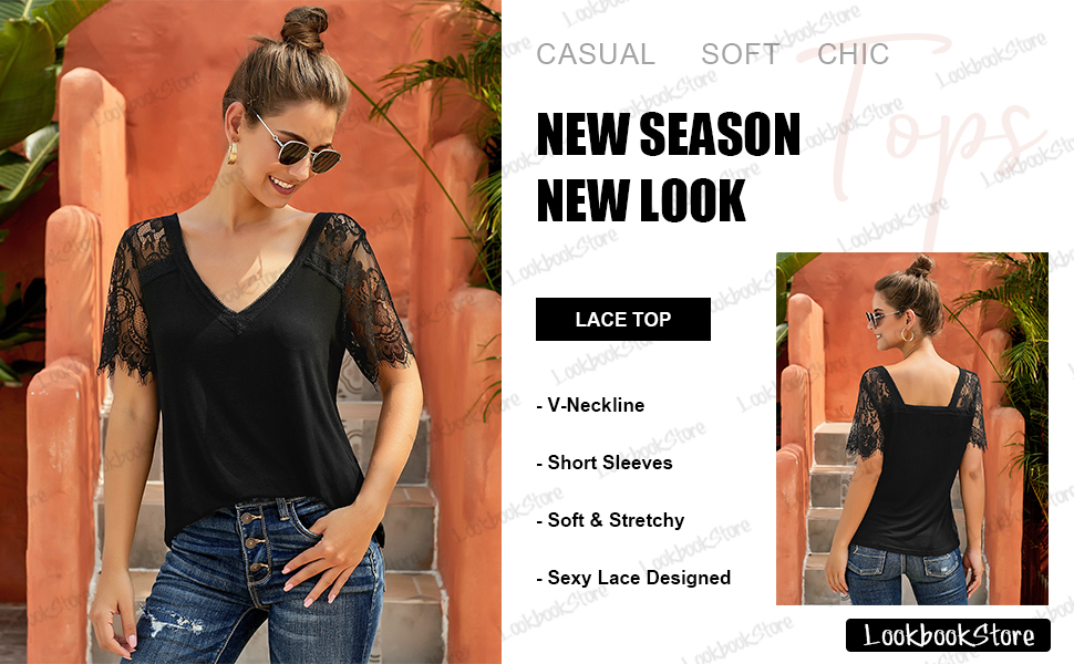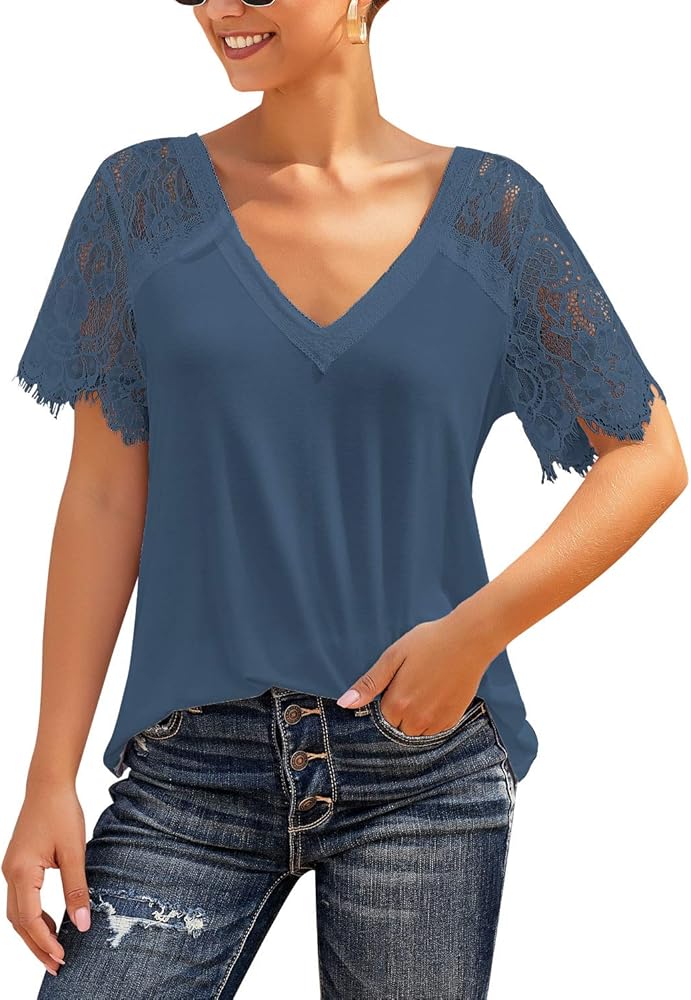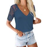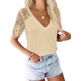 القميص الصيفي النسائي مصنوع من نسيج فائق النعومة وجيد التهوية، رقبة على شكل حرف V مثيرة بمظهر أساسي مع أكمام دانتيل شفافة ساحرة تعطي مظهرًا جذابًا رائعًا. قمصان علوية مريحة على الموضة للنساء.