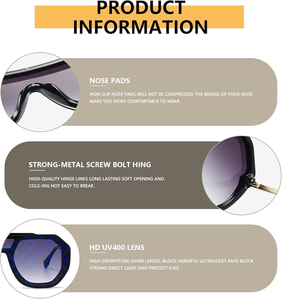 المناسبات: النظارات الشمسية الكلاسيكية ذات الإطار الكامل كبيرة الحجم مثالية للمناسبات الكاجوال والحفلات مثل الحفلات واستخدام الجوال لفترة طويلة والتسوق والتقاط الصور، بالإضافة إلى الإكسسوارات العصرية والارتداء اليومي. أعياد الميلاد ومناسبات العطلات والتجمعات العائلية هي فرص رائعة للارتداء والتباهي. ستحظى بالتقدير من قبل العديد من الأشخاص.