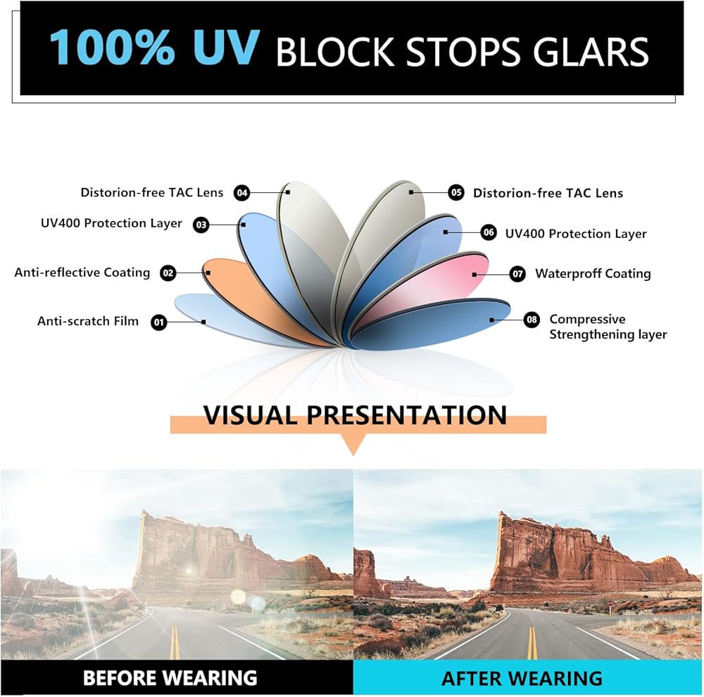 الأشعة فوق البنفسجية 400: تتميز هذه النظارات الشمسية ذات الإطار الكامل بتصنيف حماية من الأشعة فوق البنفسجية بطول موجي 400، والذي يمكنه ترشيح 100% من الأشعة فوق البنفسجية الطويلة والمتوسطة والأشعة فوق البنفسجية الأخرى، والقضاء على الوهج الذي يهيج نظارتك، وتحسين وضوح نظارتك، واستعادة الألوان الحقيقية، وحماية عينيك بشكل مثالي.