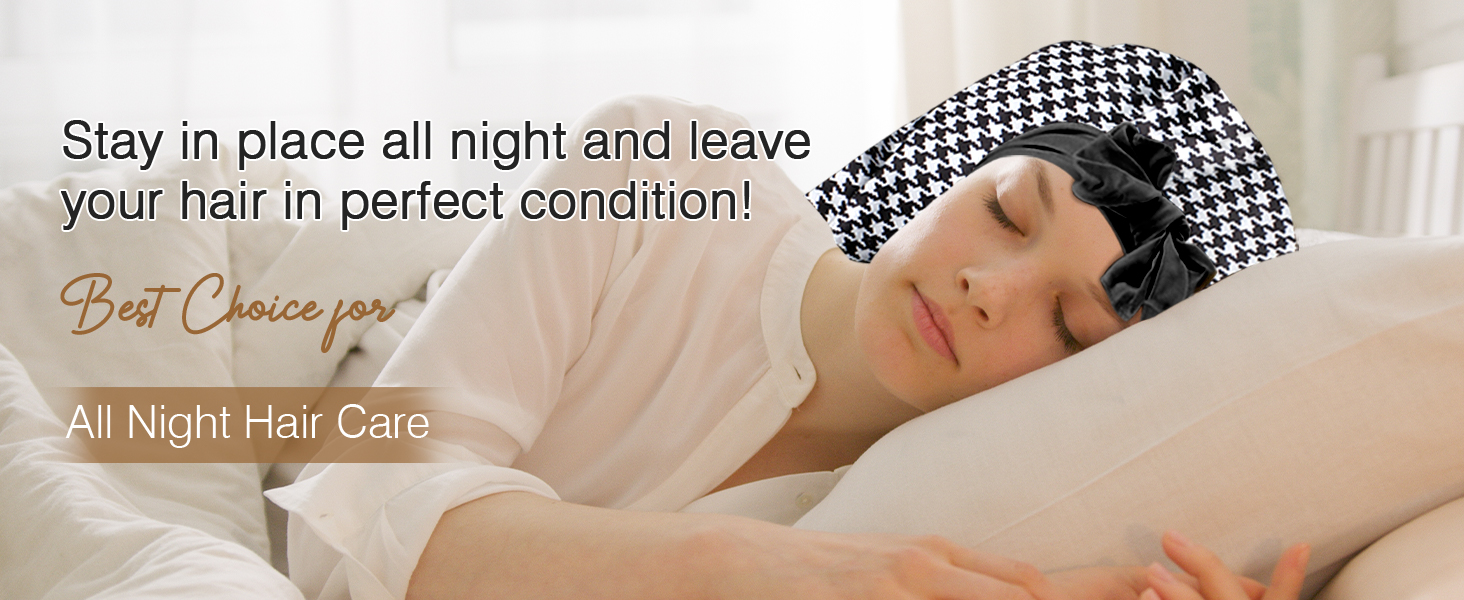 【 حجم وحزام ربط غير قابل للانزلاق قابل للتعديل】عرض القلنسوة 11.8 بوصة/30 سم وطول ربطة العنق المرنة 22 بوصة/56 سم. مقاس واحد يناسب معظم أنواع الشعر. تصميم شريط مطاطي واسع للراحة وبدون علامات: احمِ حواف جبهتك بحافة محيط الساتان الواقية؛ يبقى طوال الليل! يمكنك تعديل قبعة النوم حسب راحتك الشخصية من خلال شريط الربط المرن كما أن القلنسوة تعطي مظهرًا لطيفًا ولطيفًا عند ربطها في القوس. جربه الآن! ستحبها!