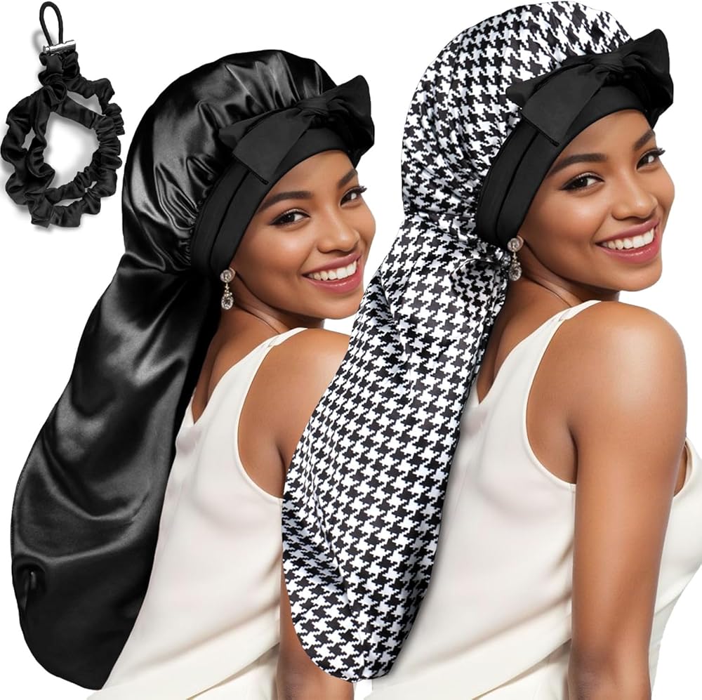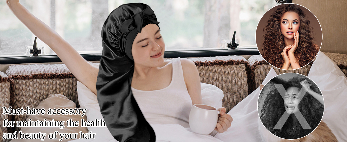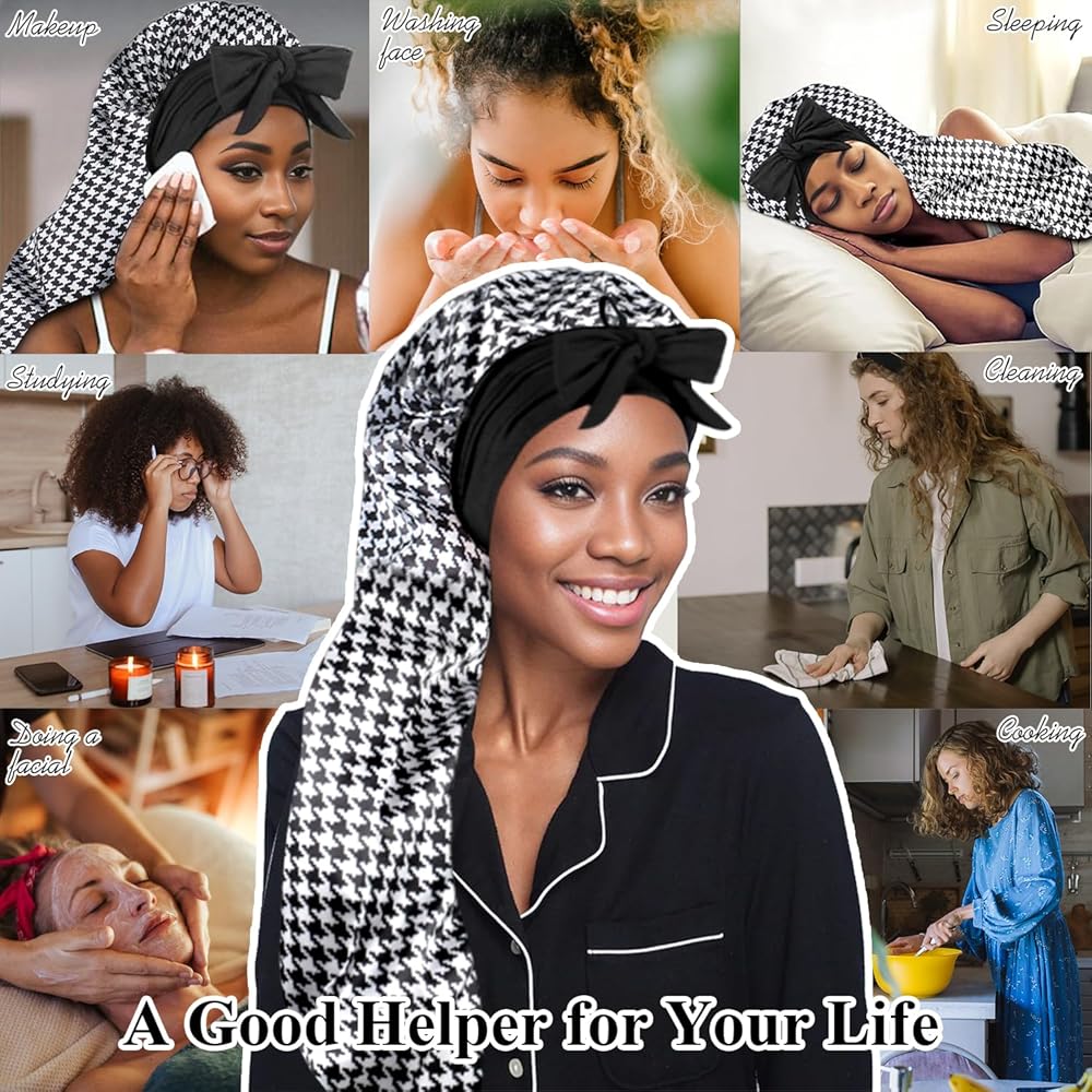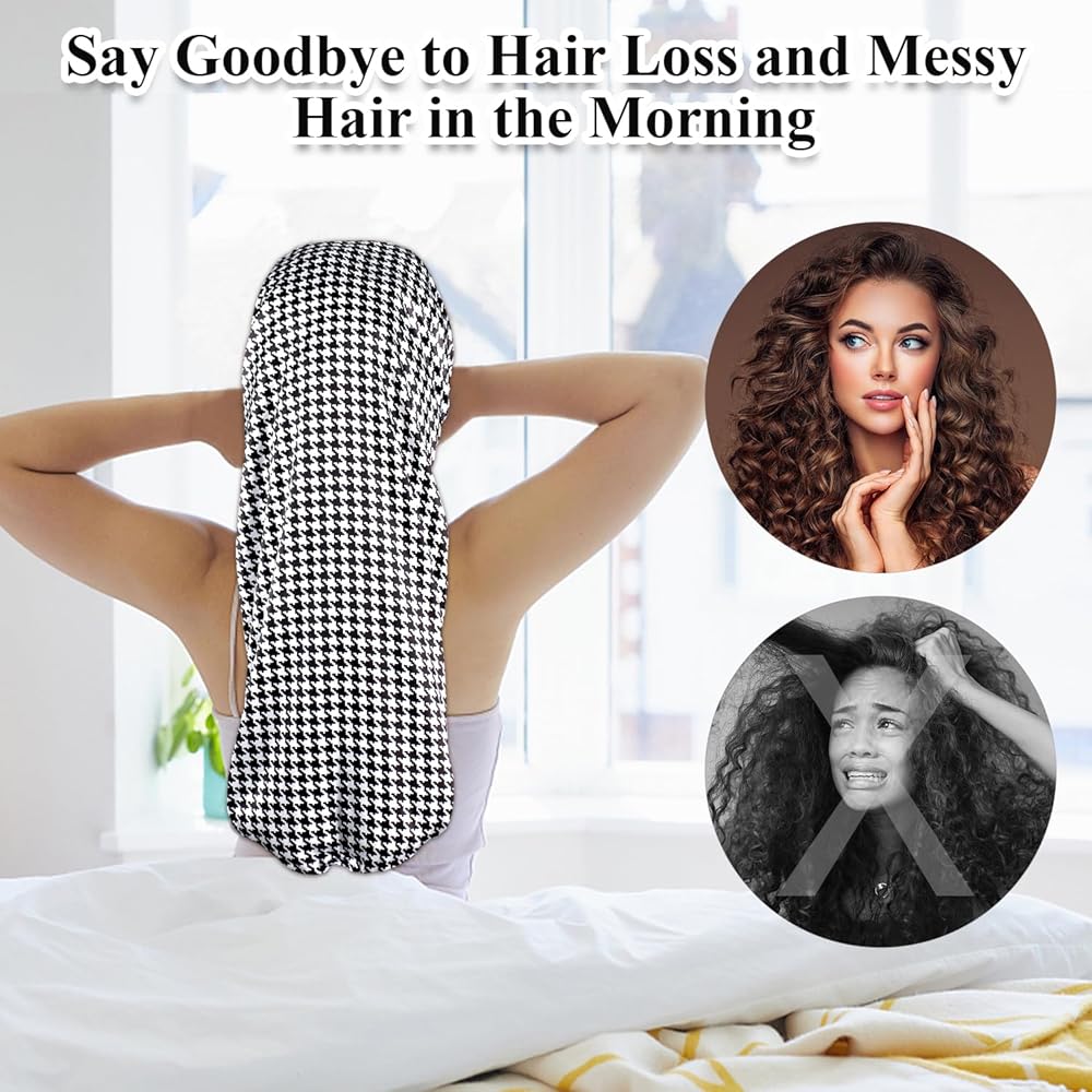 【مساعد للعناية بالشعر】غطاء الرأس للنساء هو إكسسوار يجب اقتناؤه للحفاظ على صحة وجمال شعرك. تساعد القبعة المجدولة على الاحتفاظ بالرطوبة في شعرك، وتمنع التقصف أثناء النوم. حافظي على تسريحة شعرك منتعشة وخالية من التجعد، لتحصلي على شعر ناعم في الصباح! يوفر غطاء الرأس الخاص بنا تغطية واسعة للشعر الطويل. رائعة لحمل الشعر الطبيعي، والضفائر الصندوقية، والشعر الصناعي، والنسيج، والبكرات، ومشابك الشعر، والشعر الطويل، والشعر المجعد، والشعر المجعد، والنساء ذوات وصلات طويلة.