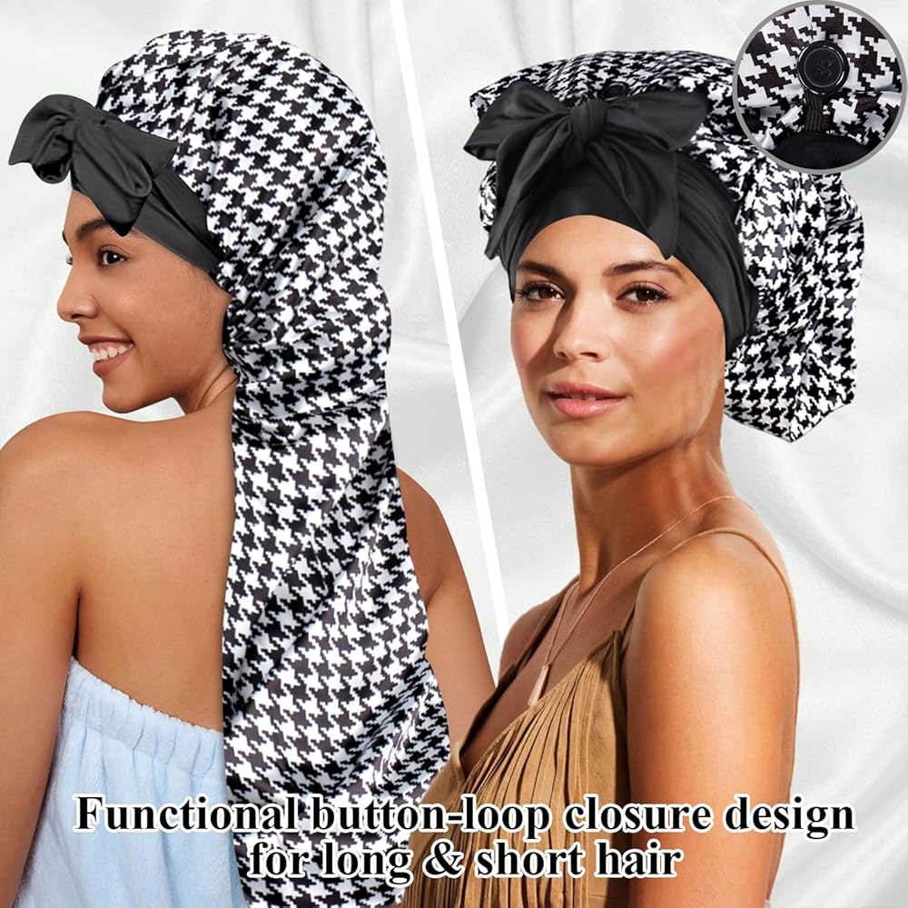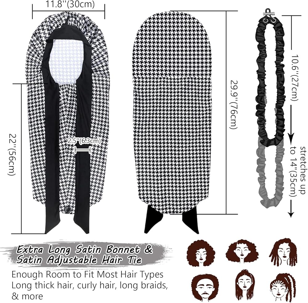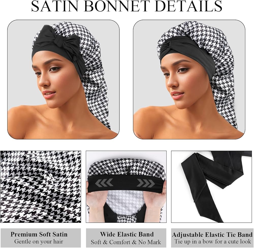【مساعد للعناية بالشعر】غطاء الرأس للنساء هو إكسسوار يجب اقتناؤه للحفاظ على صحة وجمال شعرك. تساعد القبعة المجدولة على الاحتفاظ بالرطوبة في شعرك، وتمنع التقصف أثناء النوم. حافظي على تسريحة شعرك منتعشة وخالية من التجعد، لتحصلي على شعر ناعم في الصباح! يوفر غطاء الرأس الخاص بنا تغطية واسعة للشعر الطويل. رائعة لحمل الشعر الطبيعي، والضفائر الصندوقية، والشعر الصناعي، والنسيج، والبكرات، ومشابك الشعر، والشعر الطويل، والشعر المجعد، والشعر المجعد، والنساء ذوات وصلات طويلة.