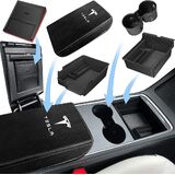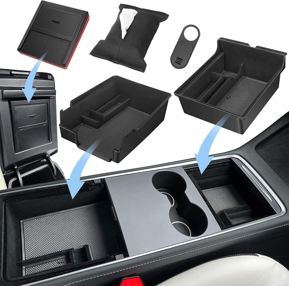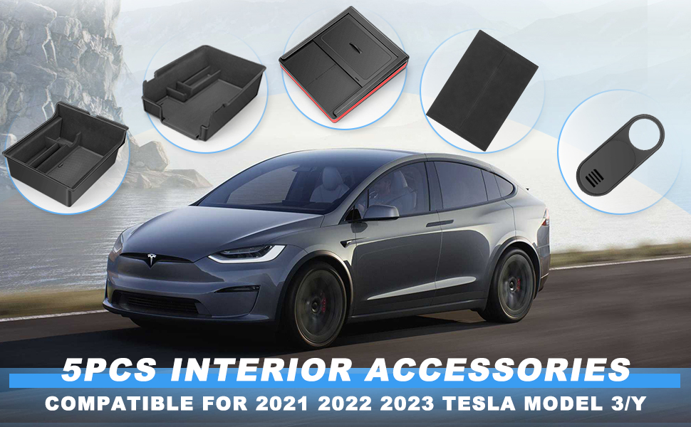 XINTUO 5 قطع 2023 صينية تنظيم وحدة التحكم المركزية المحدثة المتوافقة مع Tesla Model 3 Model Y Accessories 2023 2022 2021 مسند الذراع صندوق تخزين درج مخفي قطعة واحدة غطاء كاميرا ويب قطعة واحدة حامل مناديل
