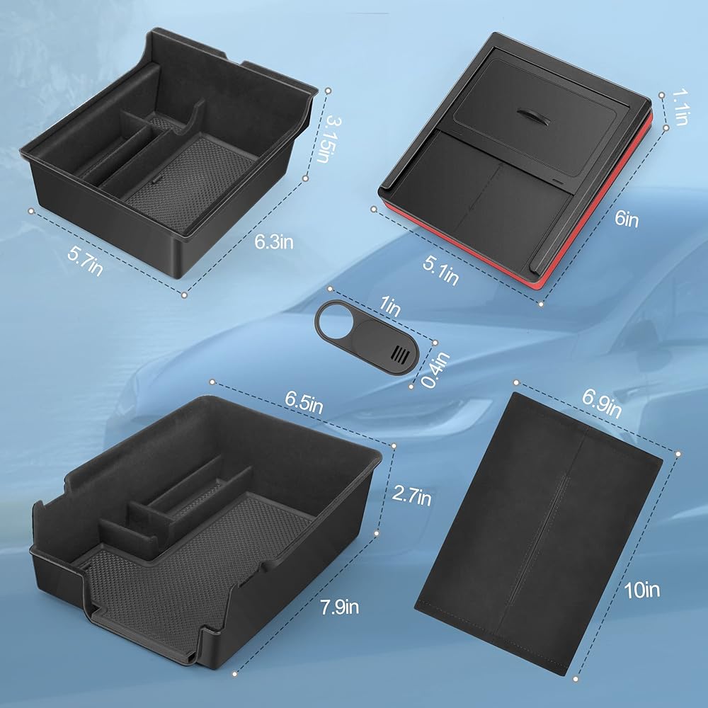 【متوافق مع ملحقات تسلا】يناسب تمامًا موديل 2023 2022 2021 Tesla Model 3 Model Y. تصميم مقطوع الحواف بدقة لن يعيق الوظائف الأصلية ولن يؤذي اليد. لا تتضمن العبوة فقط قطعة واحدة من صينية وحدة التحكم المركزية، وقطعة واحدة من صينية صندوق تخزين مسند الذراع، وقطعة واحدة صندوق تخزين مخفي لمسند الذراع، ولكن أيضًا قطعة واحدة من غطاء كاميرا الكمبيوتر المحمول متوافقة مع طراز Tesla 3/Y لحماية خصوصيتك، وحامل مناديل بإبزيم قابل للتعديل قطعة واحدة مناسب لك للوصول إلى المناشف الورقية، والقيادة الآمنة دون تشتيت الانتباه.
