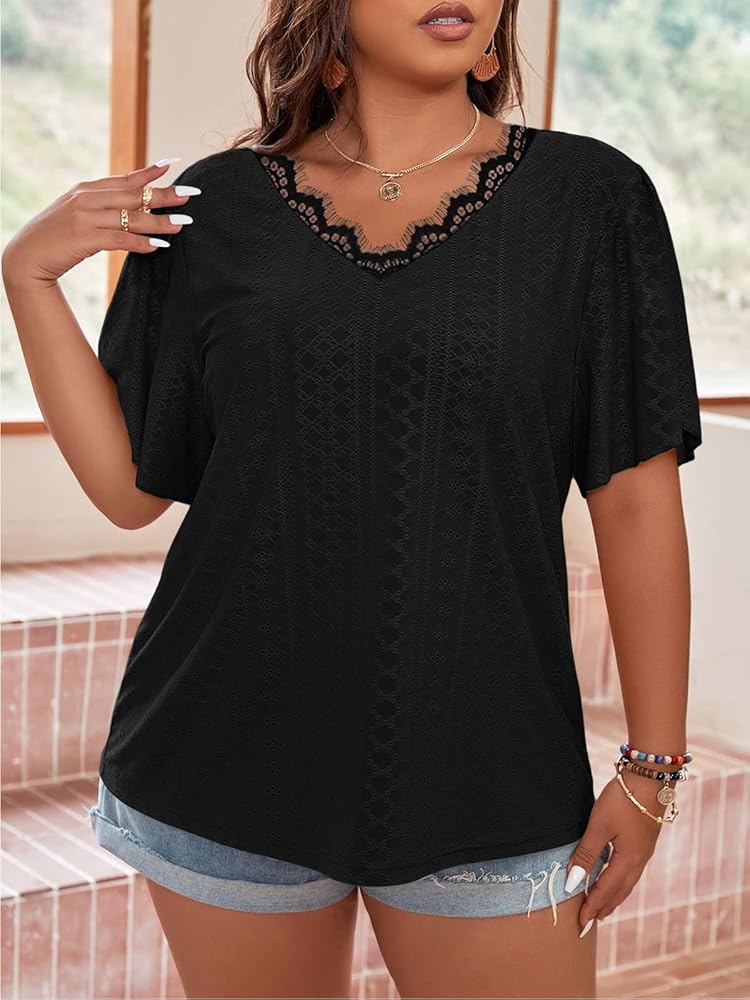 Feature: This Plus Size Tops with Cute Bell Sleeves, Unique Pointelle Design, Loose Fit, Plus Size Blouses with V-neck, Solid Color and Hollow Out, Show Your Own Fashion Temperament.