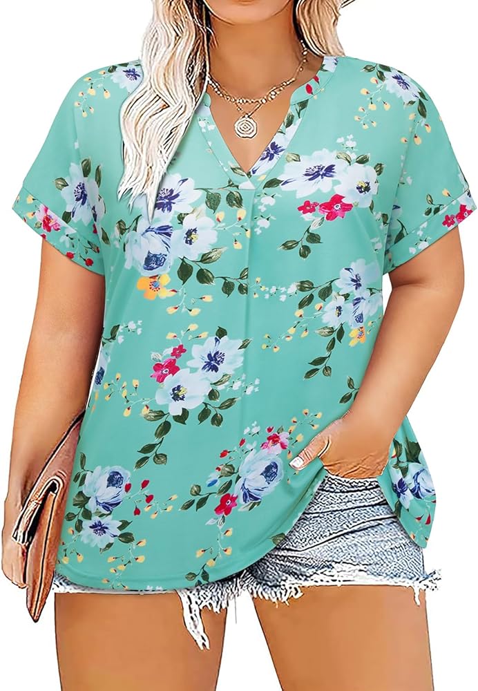 ❤ 【تصميم فريد】تيشيرتات بأكمام قصيرة بمقاس كبير، بلوزة كاجوال، بلوزة مثيرة برقبة على شكل حرف V، تي شيرت فضفاض قابل للتمدد، كتف منسدل، على طول الورك، لطيف، سادة، عصري وأنيق.