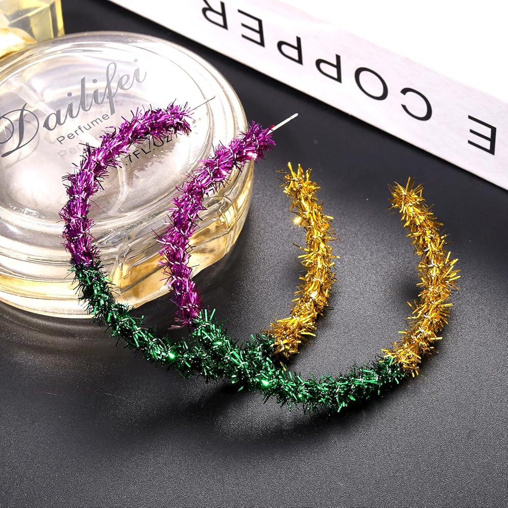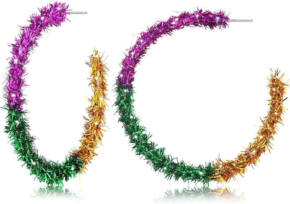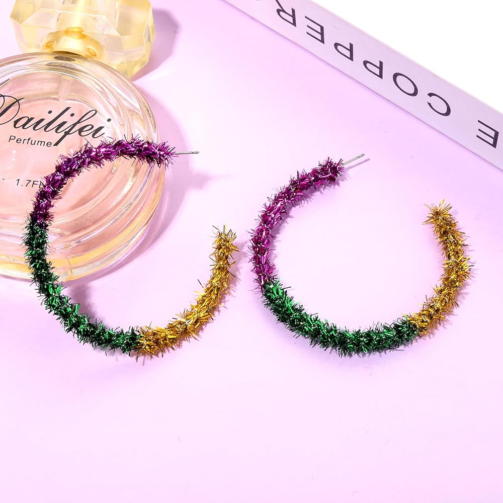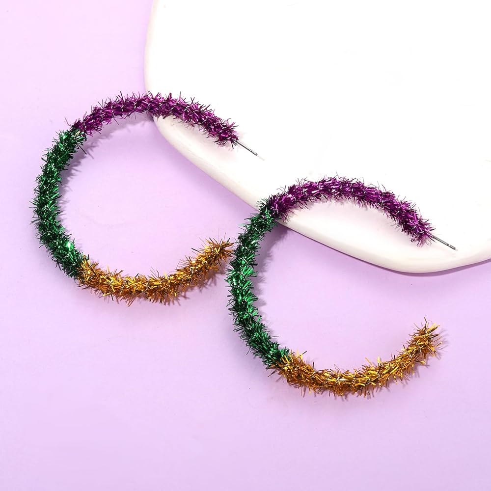 خفيفة الوزن ولامعة: حجم أقراط Mardi Gras Hoop المتدلية: 2.3 بوصة، تصميم مفتوح. لف 3 شراشيب نارية ملونة حول القرط الأطواق بالكامل للحصول على لمسة نهائية مذهلة. خفيفة الوزن ومريحة في الارتداء.