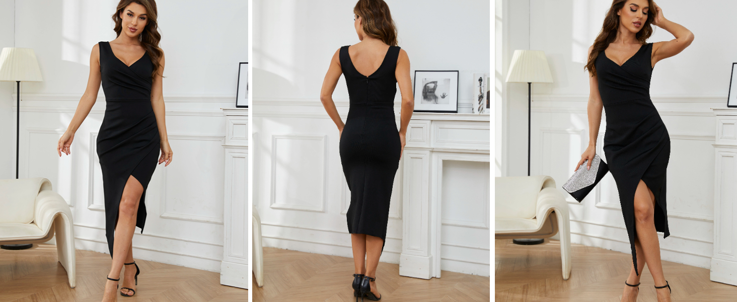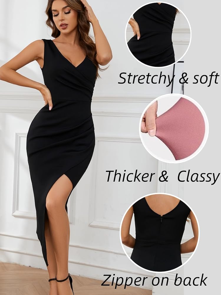 السمات: فستان وصيفة العروس متوسط الطول، رقبة على شكل حرف V، بدون أكمام، ضيق، لفافة صناعية، مكشكش، أنيق، أنيق، منطقة البطن مخفية جيد جدًا ويحتضن جميع منحنياتك بشكل لطيف