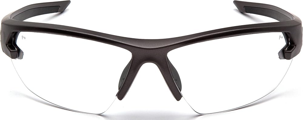 Adjustable custom-fit rubber nosepiece. Non-slip, flexible, co-injected temples. Passes ballistic MIL-PRF-32432 high velocity impact standards. Includes microfiber cleaning bag.