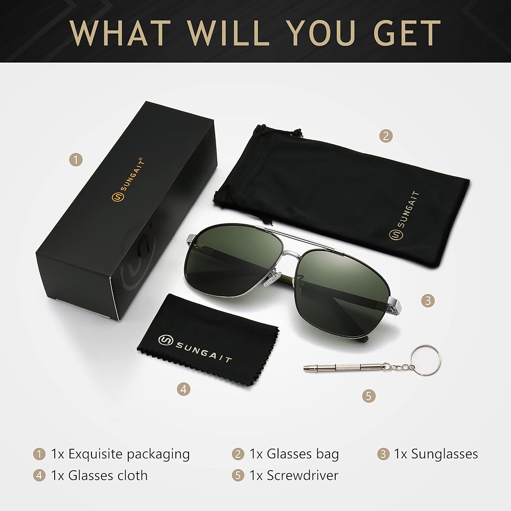 عدسات مستقطبة عالية الدقة - نظارات شمسية مستقطبة تحجب 100% من الأشعة فوق البنفسجية فئة A وB والأشعة فوق البنفسجية الضارة حتى 400 نانومتر، وتستعيد اللون الحقيقي، ومضادة للوهج لتجعل عينيك أكثر راحة. عدسات SUNGAIT TAC المستقطبة مقاومة للغاية للصدمات، ومقاومة للخدش، وخفيفة الوزن. ودائم.