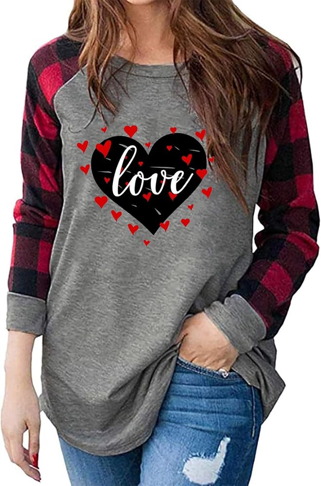 عيد الحب الحب قميص بلايز المرأة مضحك منقوشة الحب القلب تي شيرتات ورق الرسم البياني رسالة طباعة كم طويل بلايز قمصان عادية عيد الحب تي شيرت لطيف القلب قميص بلايز