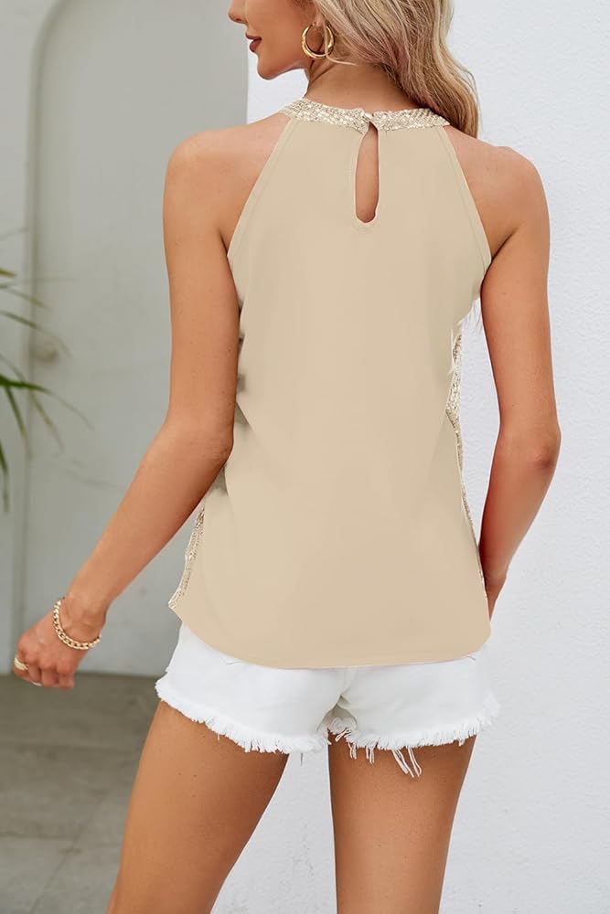 المزايا: هذا القميص بدون أكمام بالترتر مليء بالترتر من الأمام، والجزء العلوي من الرسن، بدون أكمام، وظهر من البوليستر، ومقاس فضفاض، والترتر المتلألئ يجعلك تتألق بين الناس وتكون مركز الاهتمام.