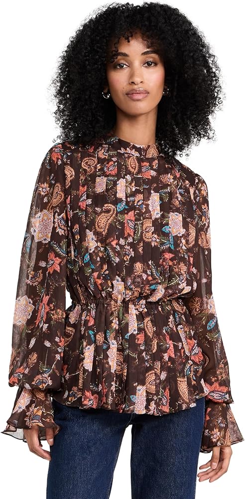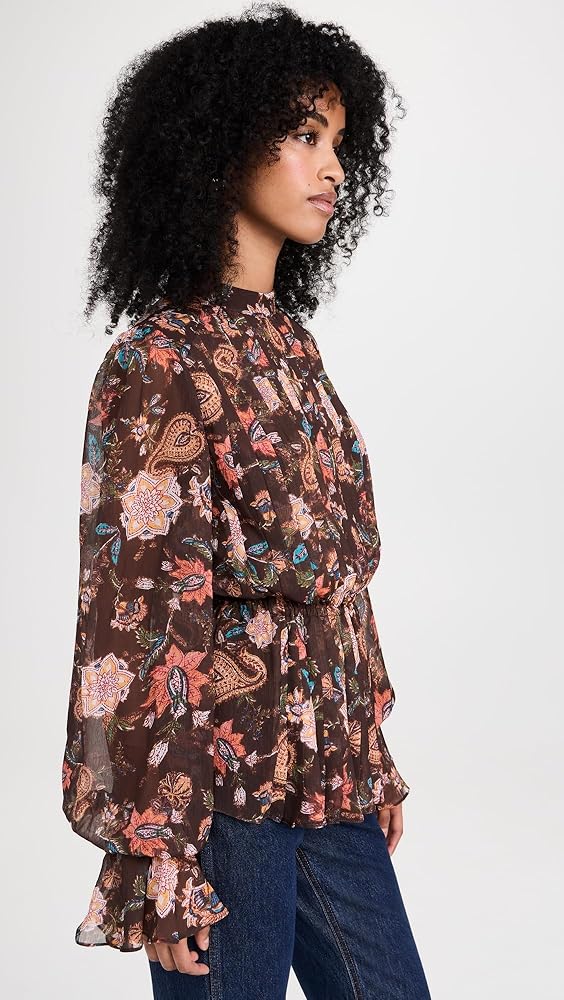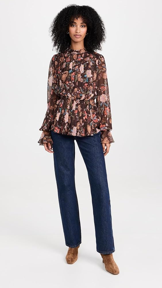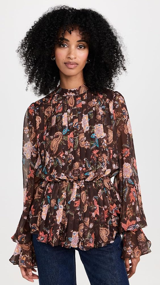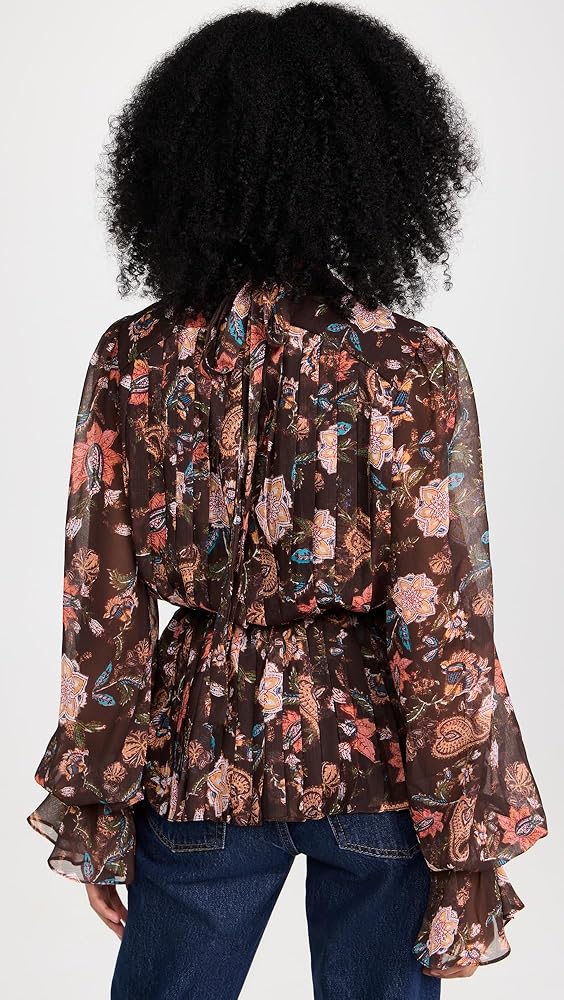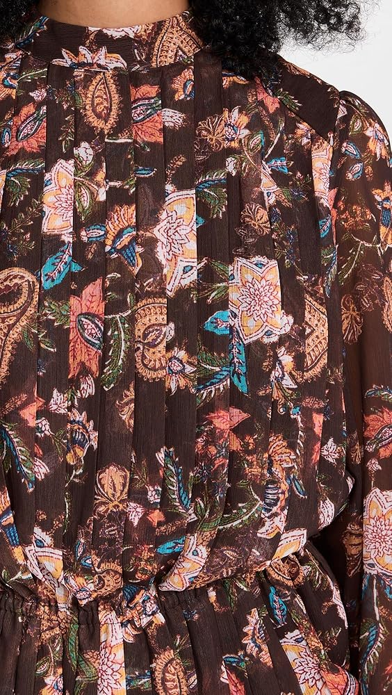 - تصميم مطوي وطباعة زهور، وأكمام طويلة مع أطراف أكمام مرنة واسعة، ومطاط مغطى عند الخصر وحاشية بيبلوم، وفتحة مفتاح للربط في الخلف