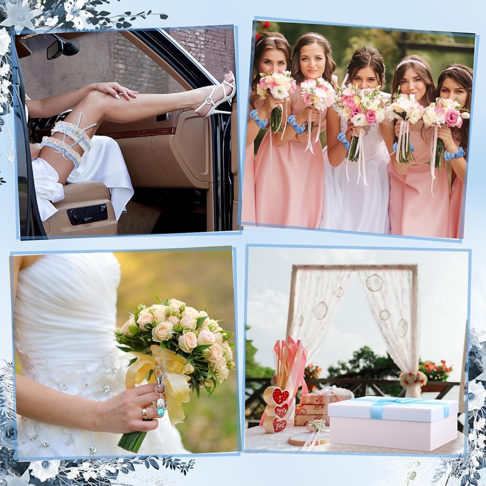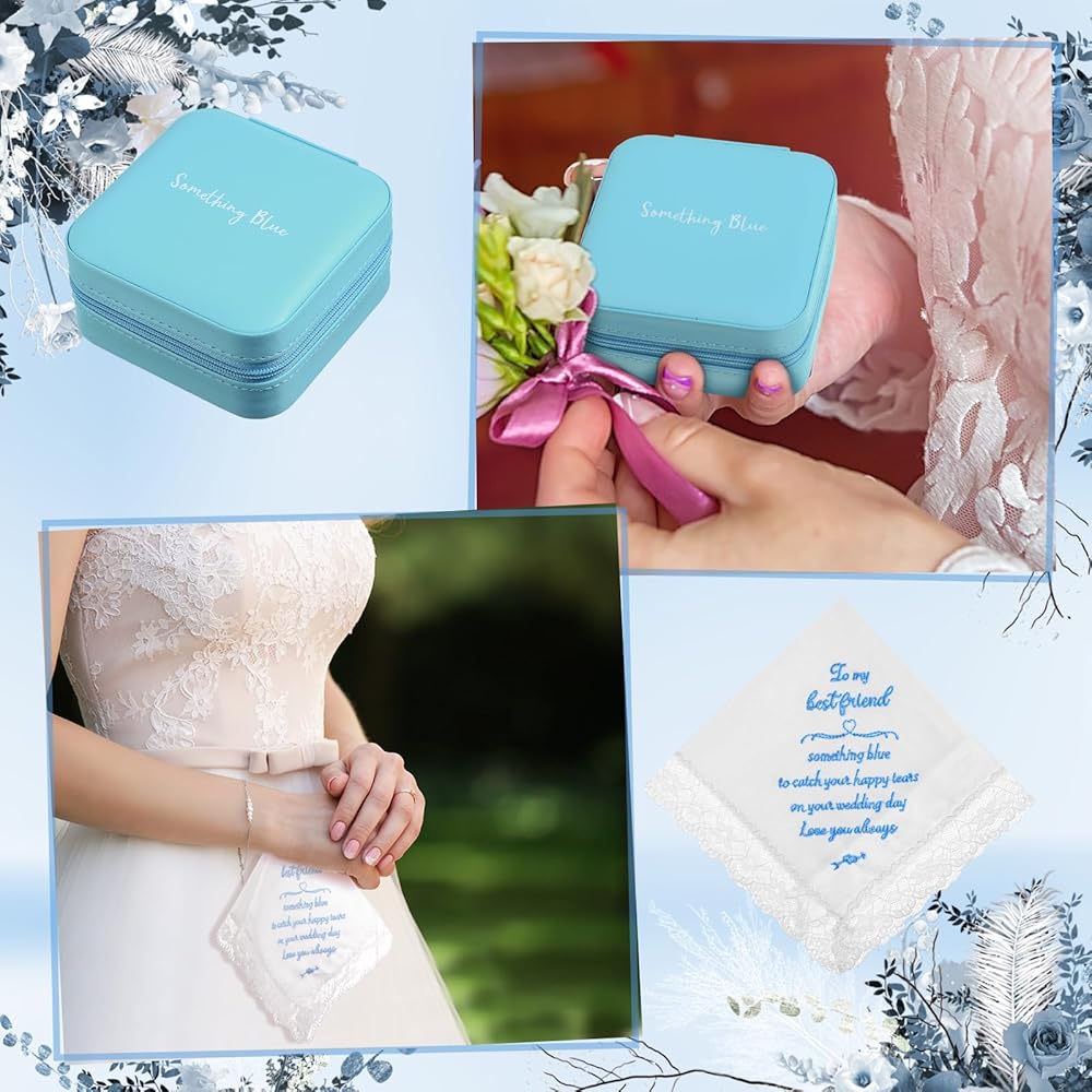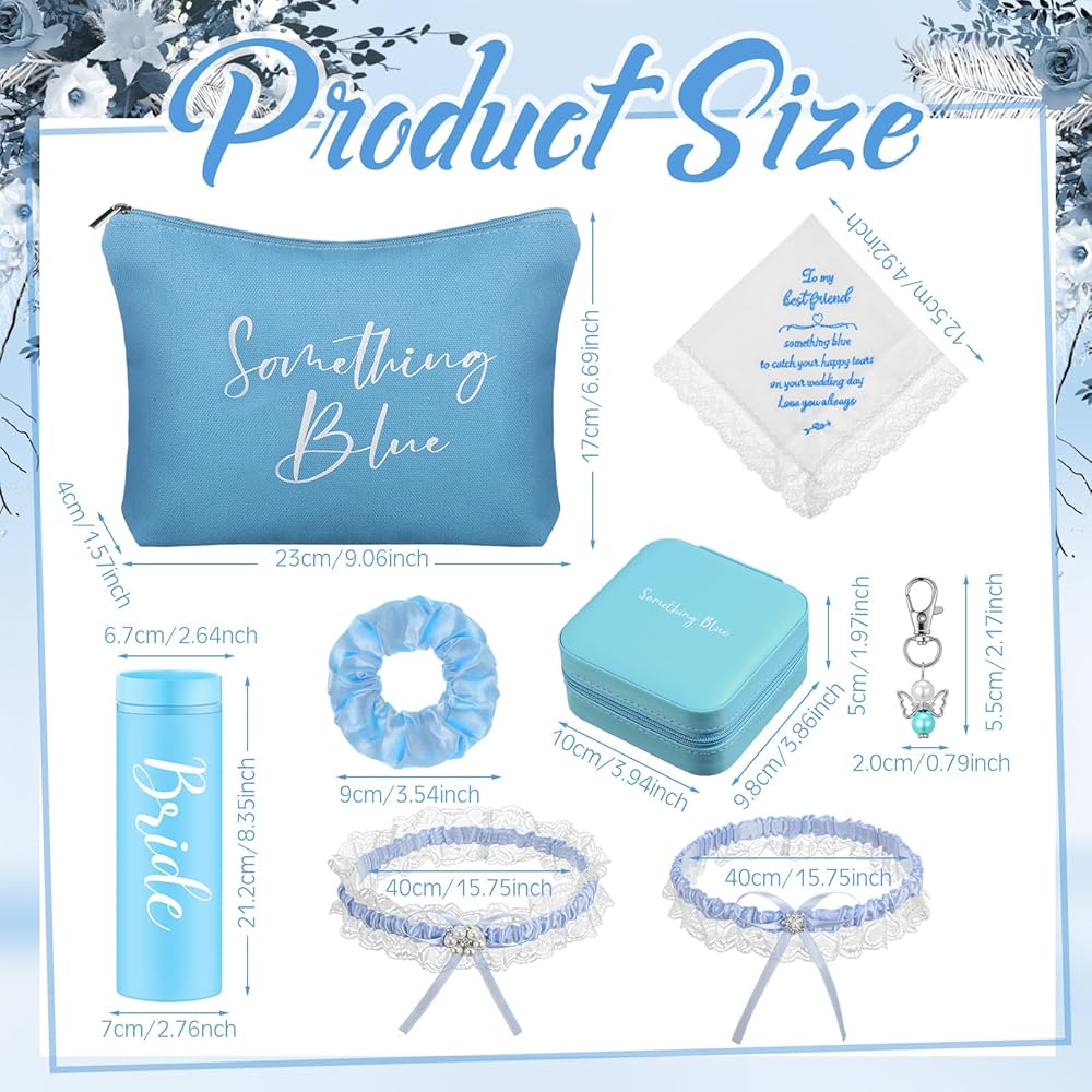 شيء أزرق للعروس: هدية العروس شيء أزرق تحتوي على منديل زفاف واحد، وقطعة واحدة من كوب أكريليك نحيف بوزن 16 أونصة، وزوج واحد من أربطة العروس من الدانتيل لحفلات الزفاف، و1 حلية باقة ملاك، و1 حقيبة مستحضرات تجميل للعرائس، و1 ربطة عنق، و1 صندوق هدايا و 1 علبة مجوهرات، هدية جيدة الصنع ومثالية للعروس أو ابنتك أو أختك أو صديقتك