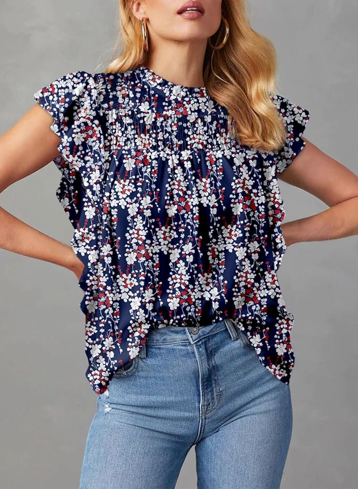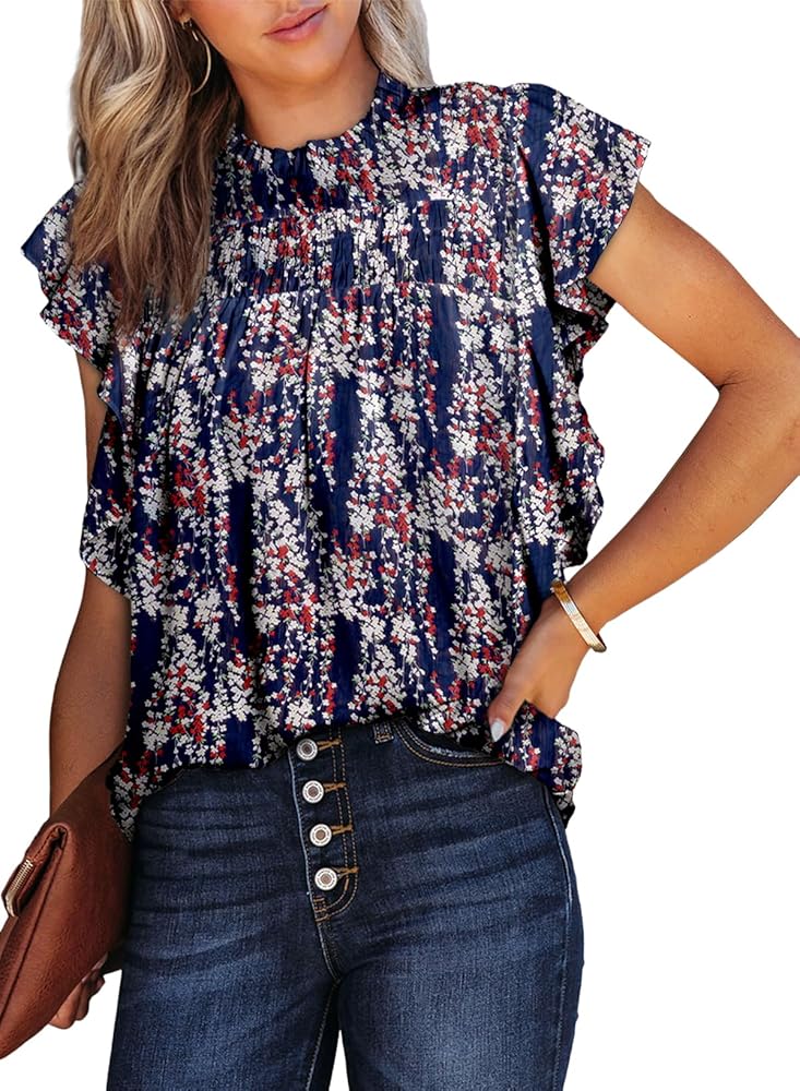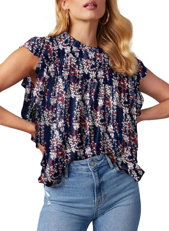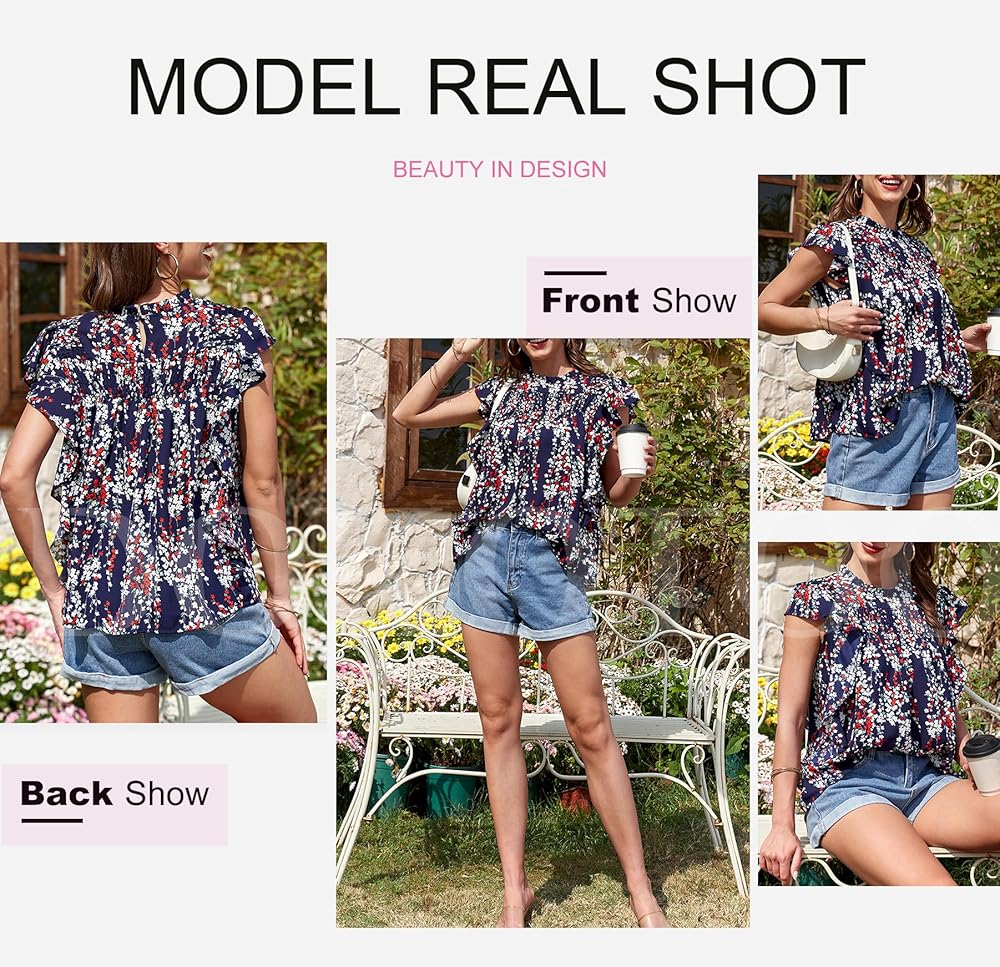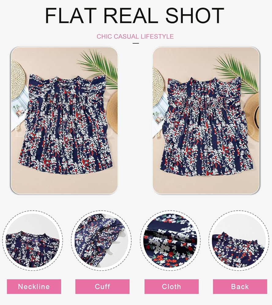 • السمات: رقبة دائرية، طباعة زهور، كم قصير مكشكش، أكمام قصيرة، تصميم قصير، نمط بيبي دول، قماش خفيف الوزن، قمصان فضفاضة