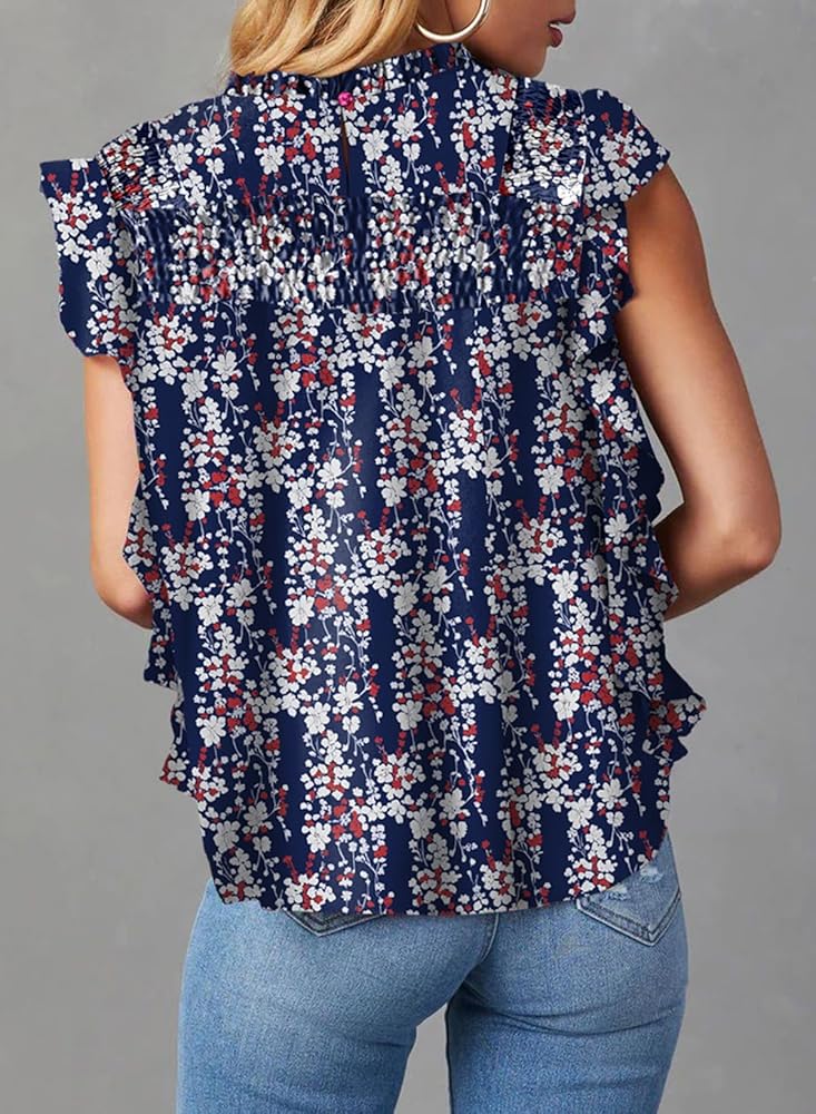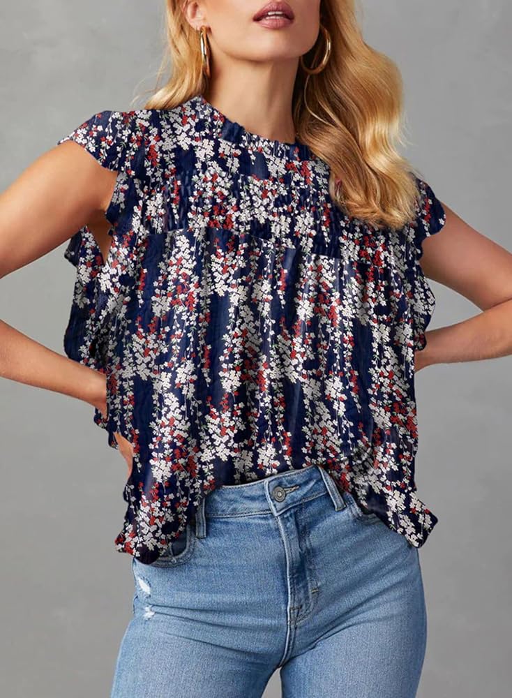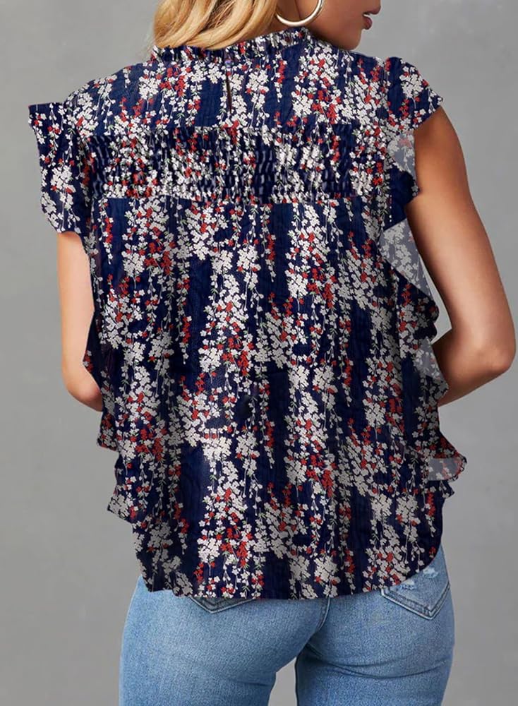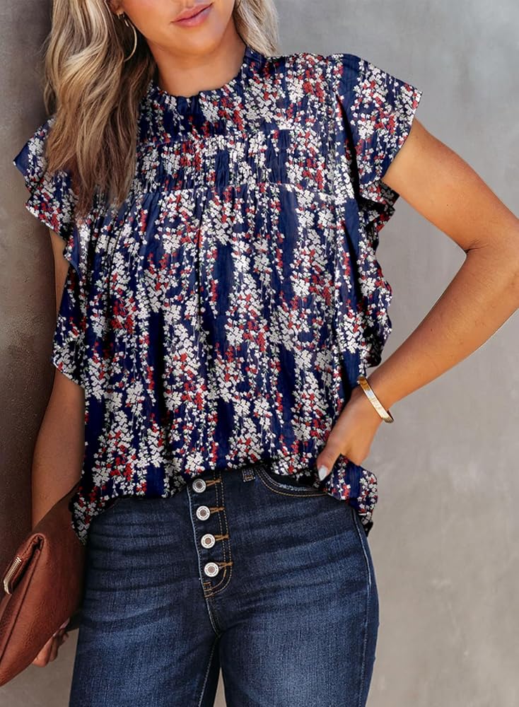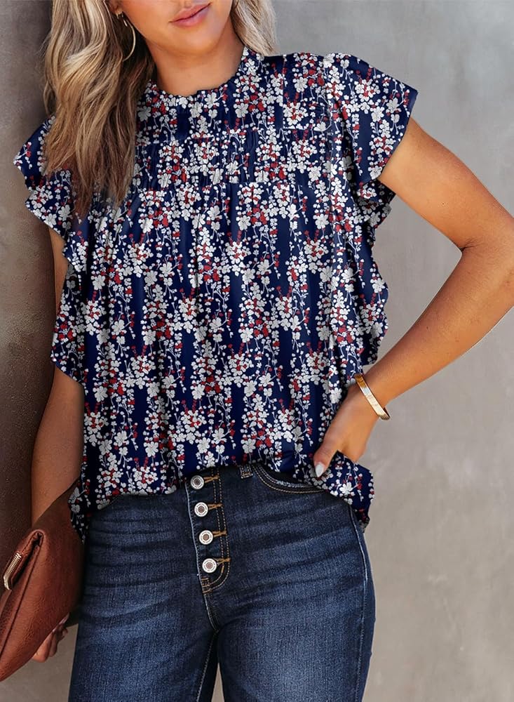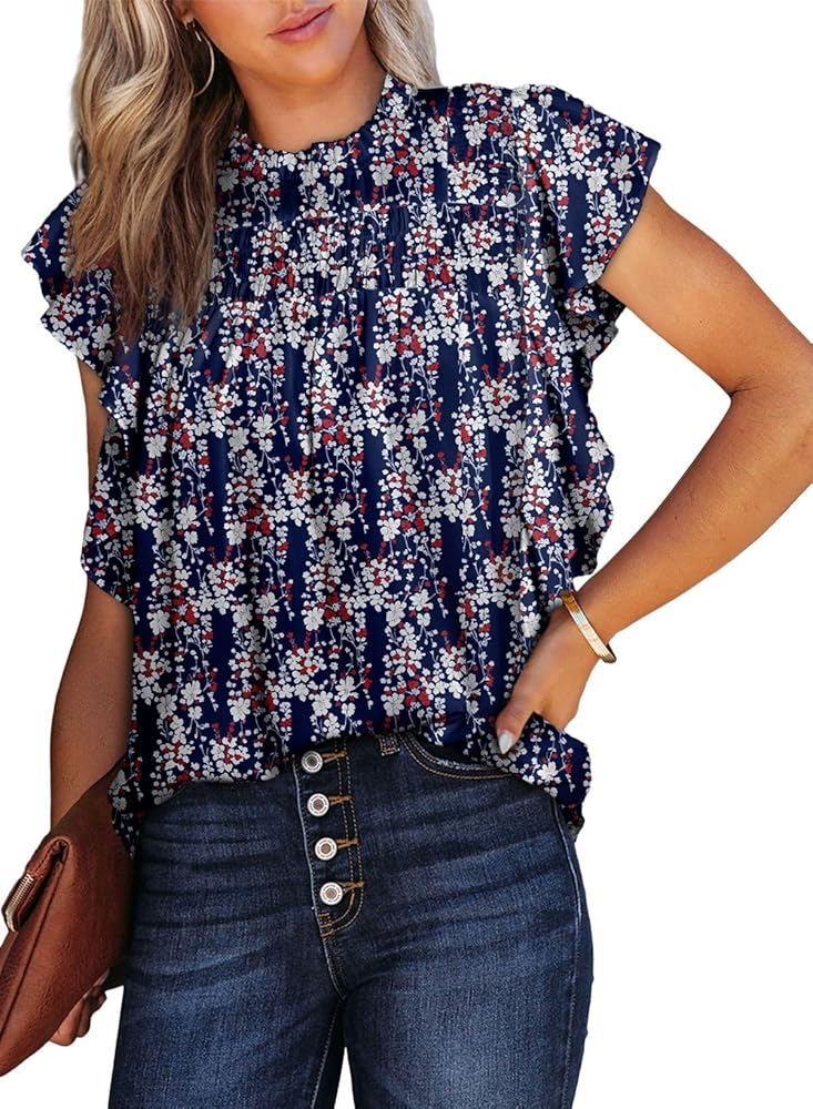 • السمات: رقبة دائرية، طباعة زهور، كم قصير مكشكش، أكمام قصيرة، تصميم قصير، نمط بيبي دول، قماش خفيف الوزن، قمصان فضفاضة