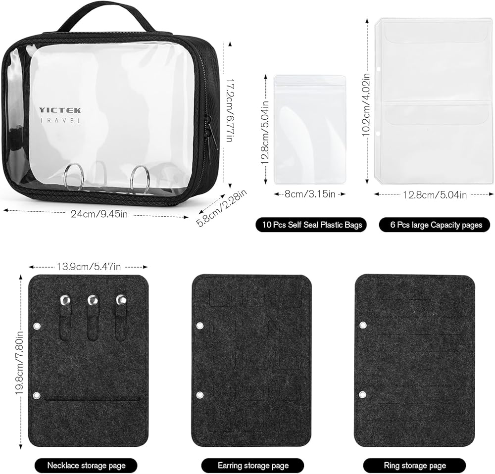 VERSATILE AND LARGE CAPACITY FOR YOUR DIFFERENT KINDS OF JEWELRY :What you will get are 1 clear pvc jewelry organizer bag(9*1.8*5.9), 6 pcs of large and frosted loose-leaf pages, 12 pcs clear grids(3.2*4.7inch),1* necklace page, 1* ring holder page and 1 earing holde page, which can store your different kinds of jewelry all in this one bag, meeting your daily or travel use.