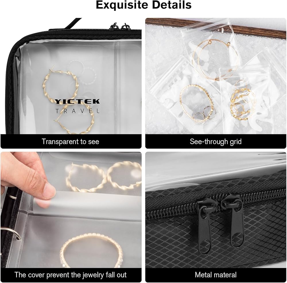 حاويات زجاجات السفر الفارغة من YICTEK + حقيبة تنظيم المجوهرات بحجم السفر مع صفحات غطاء علوية واسعة، شفافة وكبيرة السعة لتخزين المجوهرات، صفحات مجلد منظم المجوهرات مع أكياس كيس للرقبة