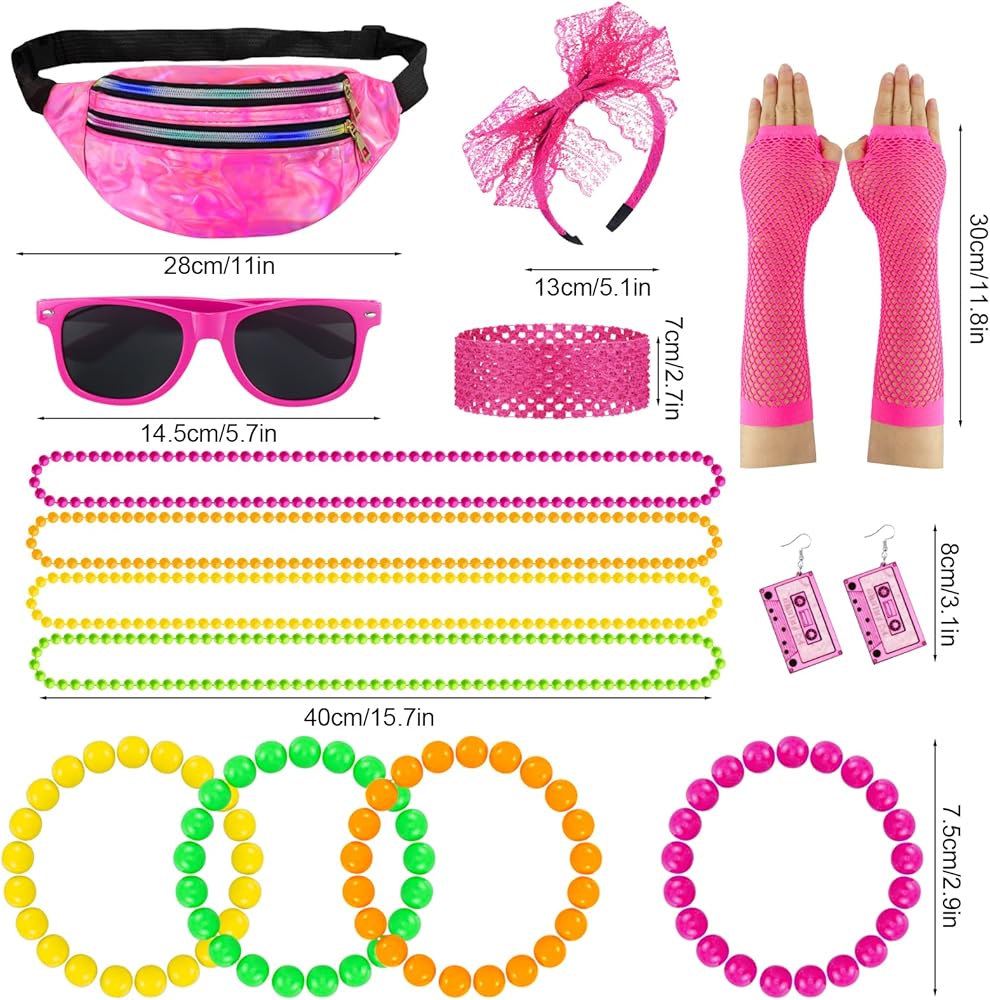 مادة صديقة للبشرة - الحقيبة ثلاثية الأبعاد مصنوعة من البولي يوريثان الناعم، وعصابات رأس نيون الثمانينيات للسيدات مغطاة بنسيج الدانتيل، والقفازات الشبكية مصنوعة من نسيج ناعم مع مرونة جيدة، والنظارات، وأقراط الثمانينيات، وقلادة وأساور الثمانينيات كلها مصنوعة من البلاستيك. إكسسوارات أزياء الثمانينيات الرائعة لجميع النساء والفتيات والأطفال!