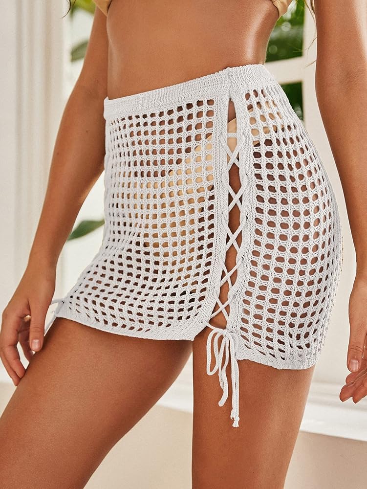 - تتميز التنورة المصنوعة من الكروشيه بخصر عالٍ وطول صغير ونمط كروشيه شفاف، وتنورة تغطية برباط مزدوج وتنورة تغطية بحاشية شرابة للاختيار من بينها.