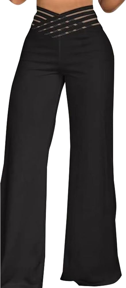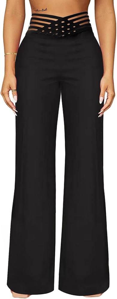 • المزايا: سراويل Palazzo عالية الخصر تتميز بأرجل واسعة، تصميم خصر متقاطع على شكل حرف V، خصر مرن، مقاس فضفاض، لون ثابت