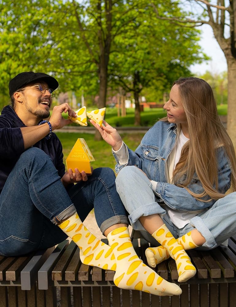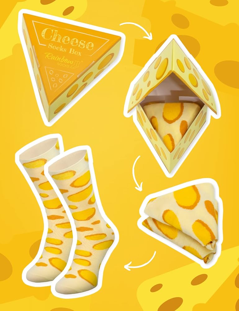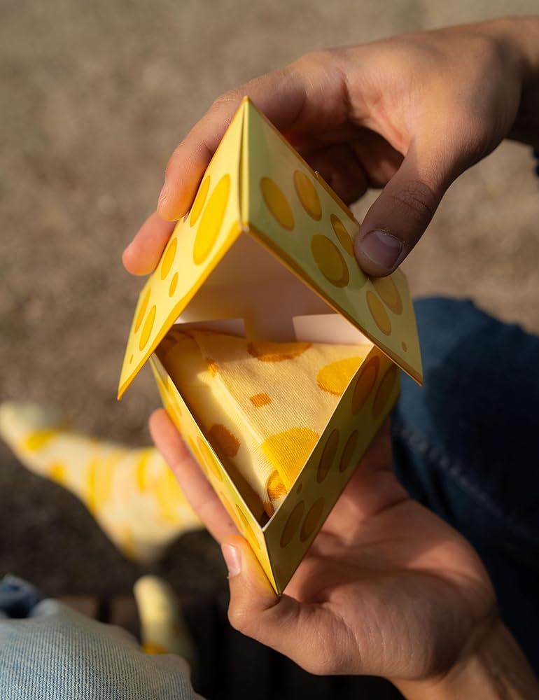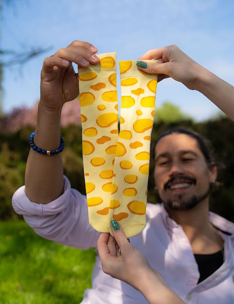 أصفر مع ثقوب كبيرة! - بدءًا من اليوم، سيكون لديك دائمًا وجبتك الخفيفة المفضلة بجانبك! الجوارب متوفرة بمقاسات: الاتحاد الأوروبي 36-40 / الولايات المتحدة 5.5-9، الاتحاد الأوروبي 41-46 / الولايات المتحدة 9.5-13 أو الاتحاد الأوروبي 47-50 / الولايات المتحدة 13.5-15. بالنسبة لعشاق الجبن الحقيقيين، لدينا أيضًا ملابس داخلية للنساء والرجال بنفس التصميم - في ما يصل إلى 6 إصدارات!