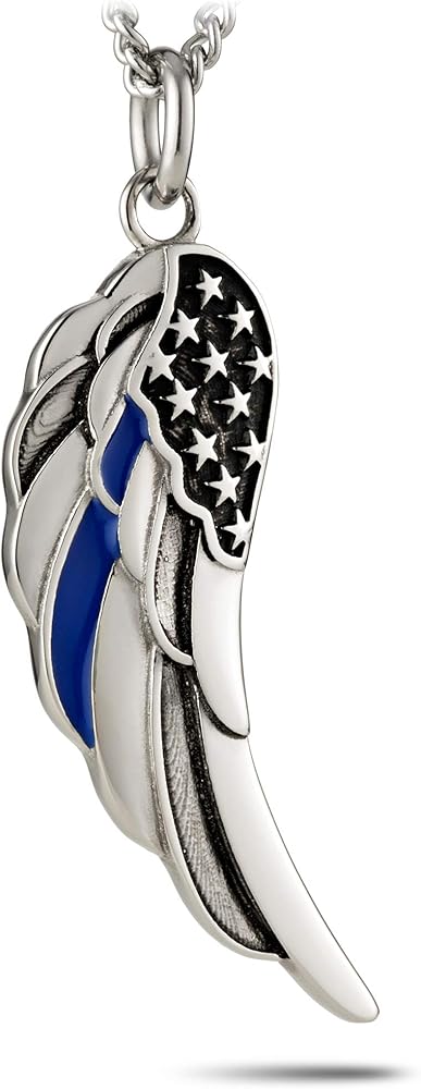 • DESIGN - Beautiful multi-dimensional Angel Wing necklace adorned with the American Flag and a blue feather representing the men and women who form a thin blue line separating good from evil. The Scripture is clear, Angels watch over all who believe in Jesus Christ. Shields of Strength is a Texas based Company. We stand behind our designs.