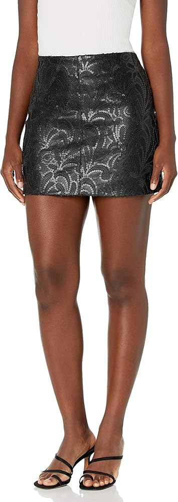 تنورة صغيرة من الجلد النباتي الأسود مع تفاصيل مطرزة بالترتر الأسود غير اللامع.