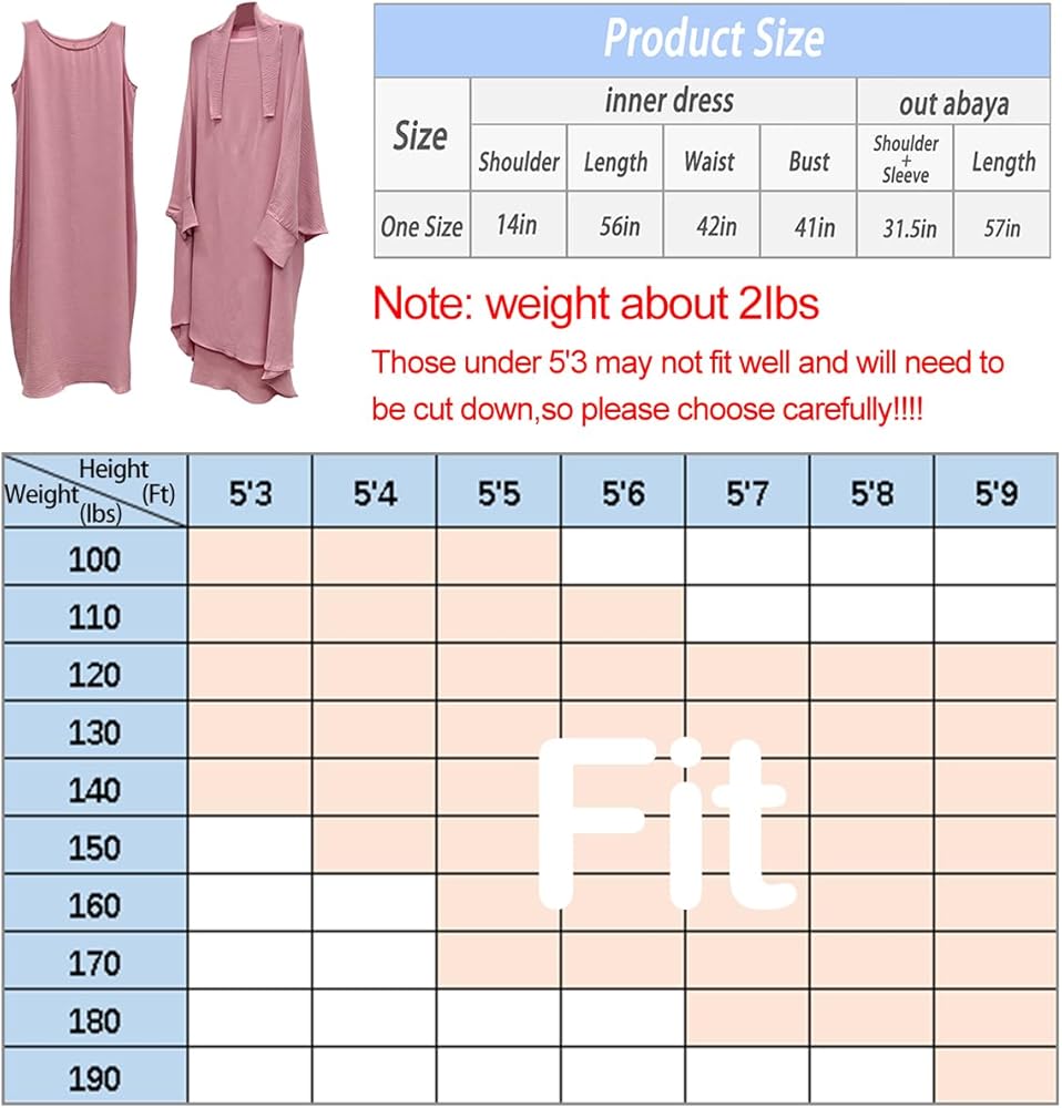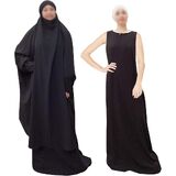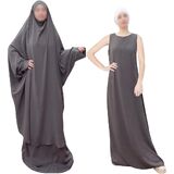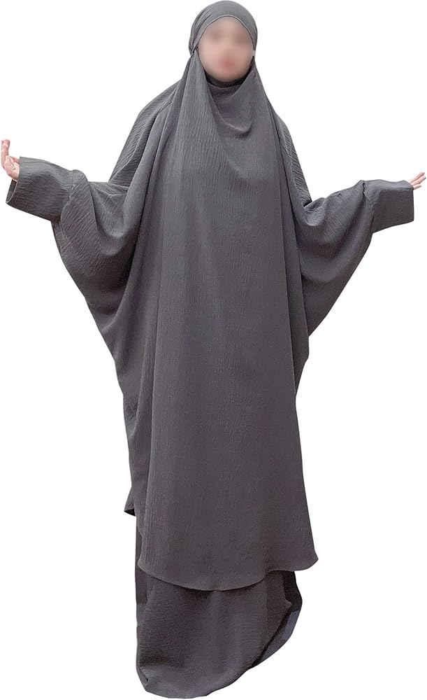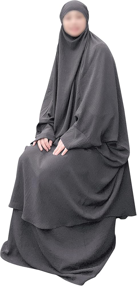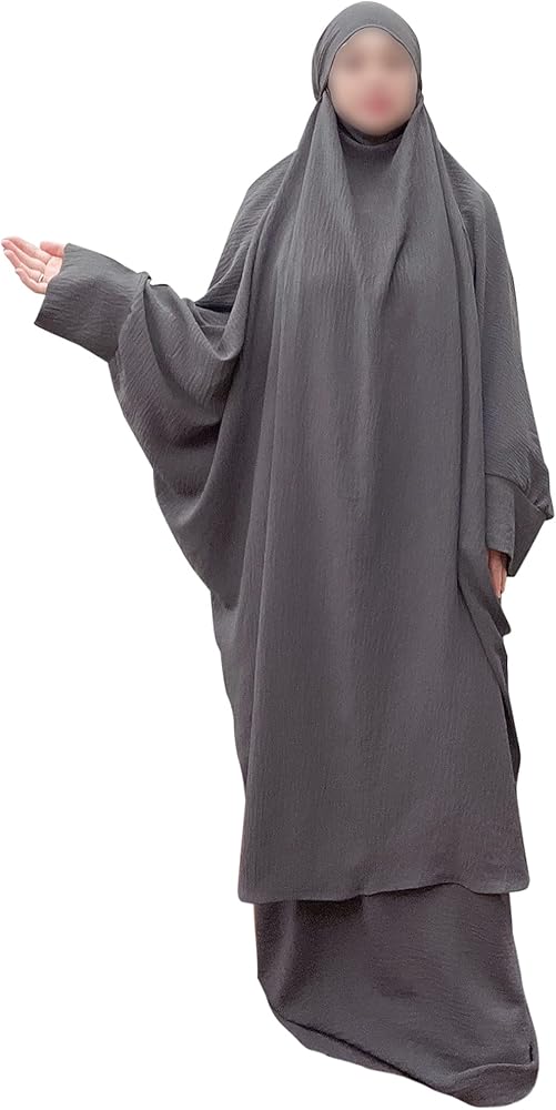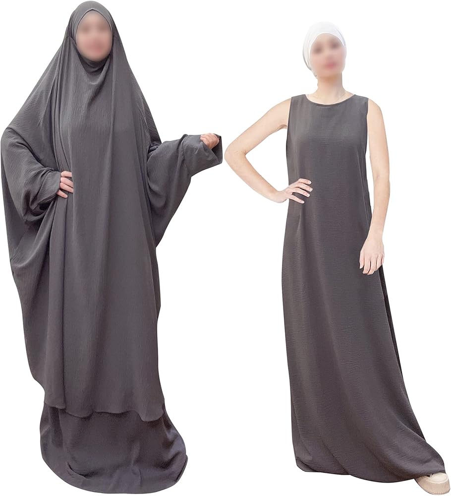 [ارتداء] طقم مكون من قطعتين. تتكون مجموعة العباءة الإسلامية هذه من بلوزة مع حجاب وفستان بلا أكمام. عندما تحتاجين إلى الخروج أو الصلاة، يمكن ارتداء طقم الجلباب هذا بسرعة وسهولة. ألوان ثابتة بسيطة ومقاس واحد يناسب معظم الأشخاص، عندما ترتديه على الجسم لن تشعر بالضيق، وتبدو متواضعة جدًا.