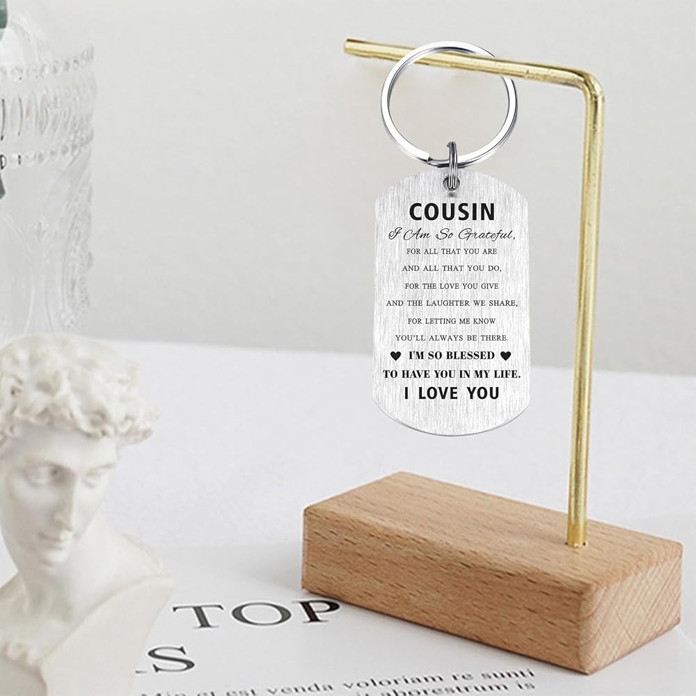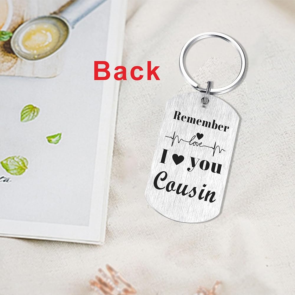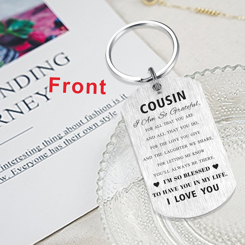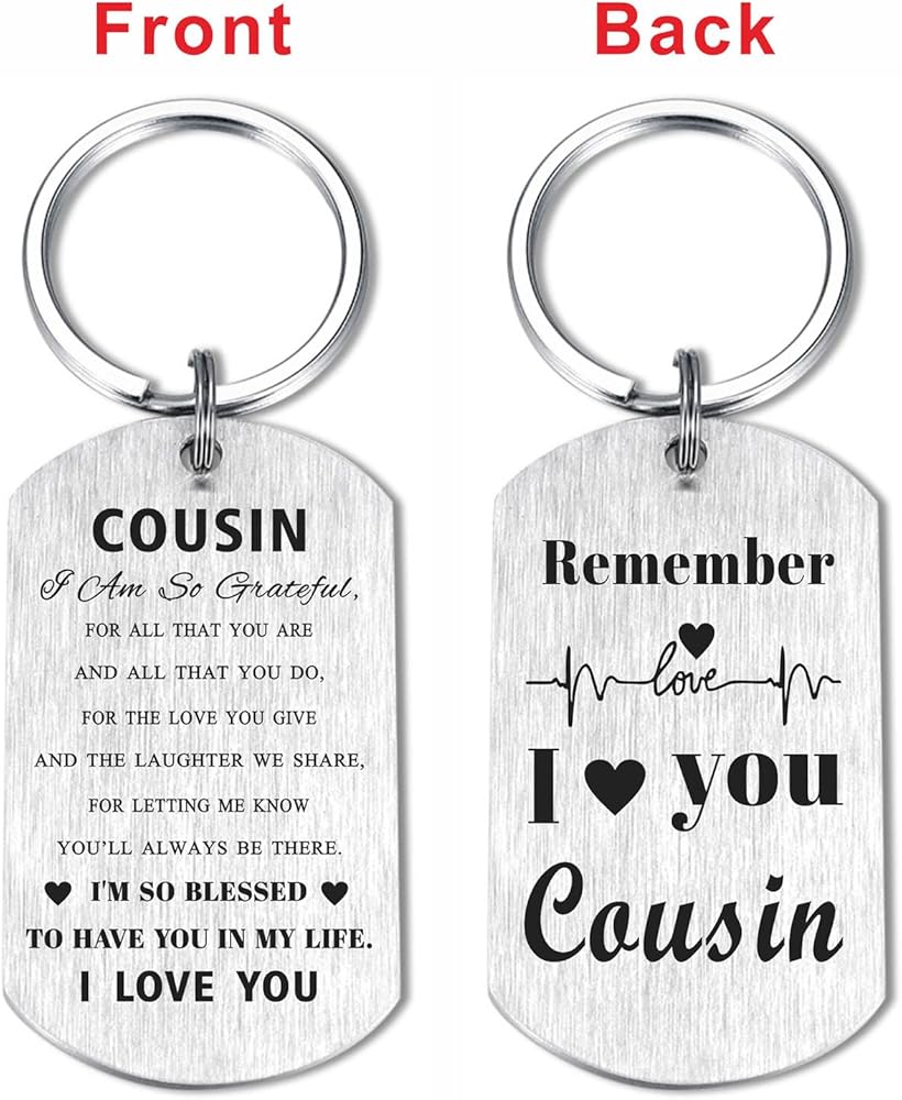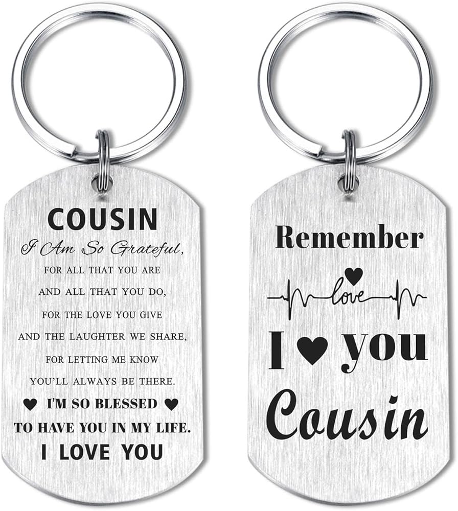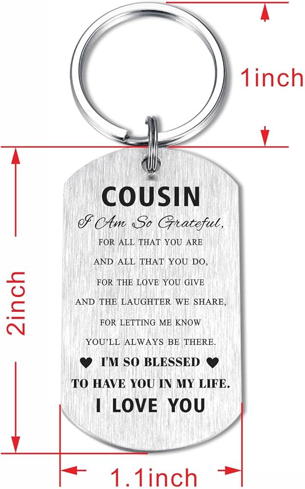 • سلسلة مفاتيح منقوشة على الجانبين - منقوش على أحد الجانبين "تذكر أنني أحبك يا ابن عم"، وعلى الجانب الآخر منقوش عليه "ابن عمي العزيز، أنا ممتن للغاية، لكل ما أنت عليه وكل ما تفعله، من أجل الحب الذي تقدمه والضحك الذي نقدمه "شارك، لإخباري أنك ستكون هناك دائمًا. أنا محظوظ جدًا لوجودك في حياتي. أنا أحبك"