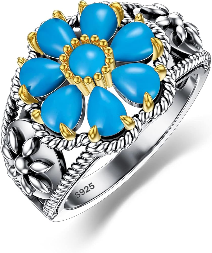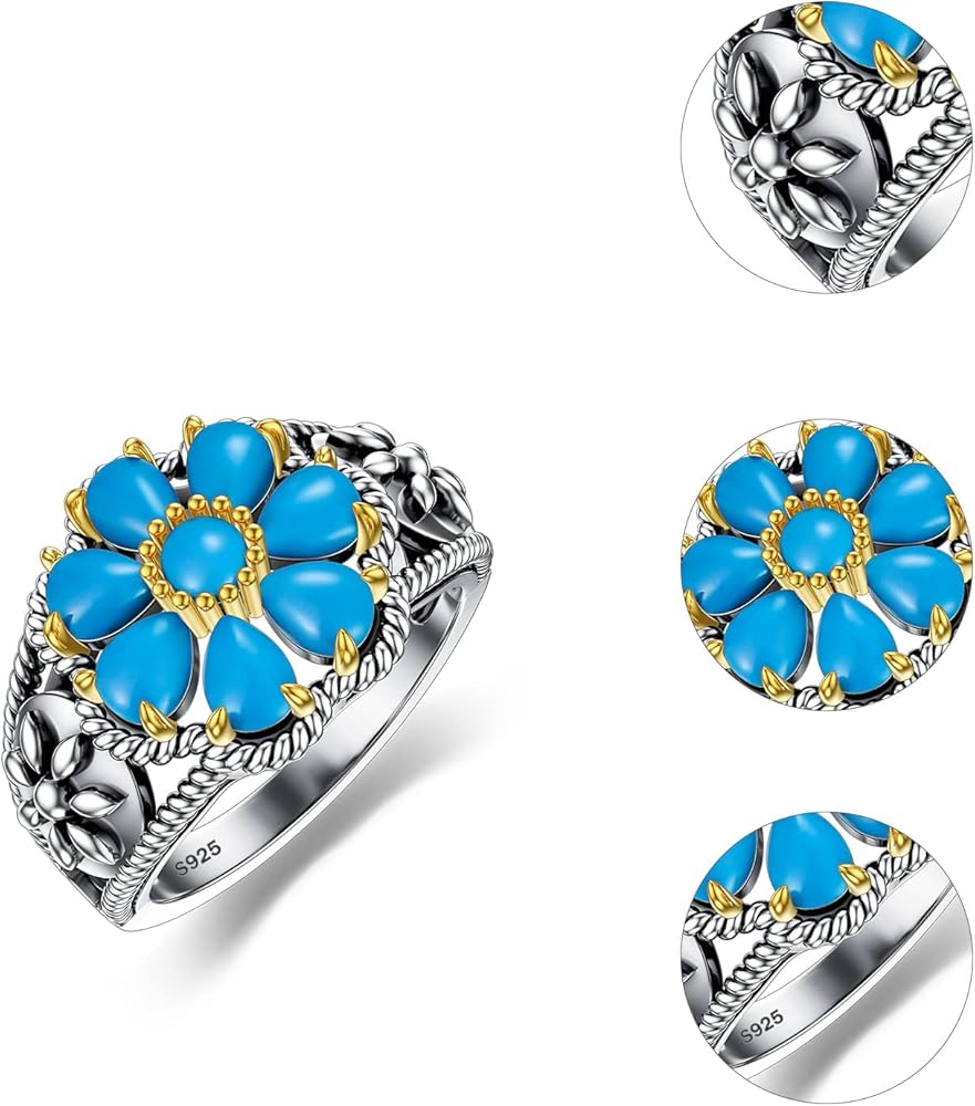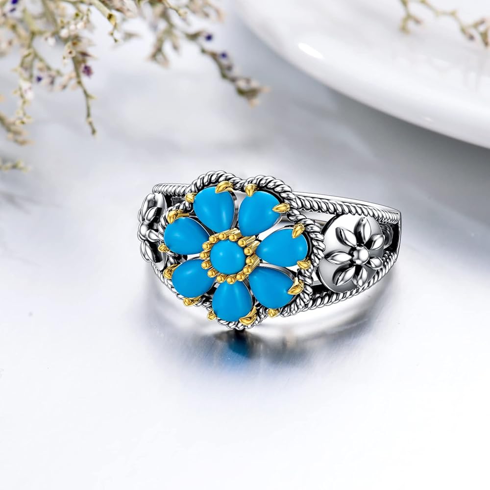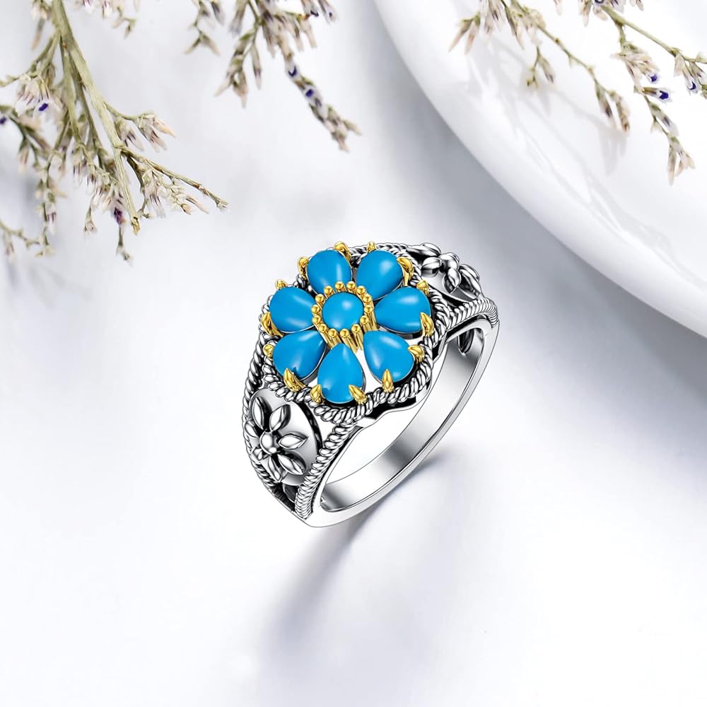 PLATYCO خاتم فيروزي مقاس 7/8/9 925 من الفضة الإسترليني خمر زهرة الفيروز والأحجار الكريمة بيان خاتم البوهيمي الفيروز مجوهرات هدايا للنساء أمي زوجة