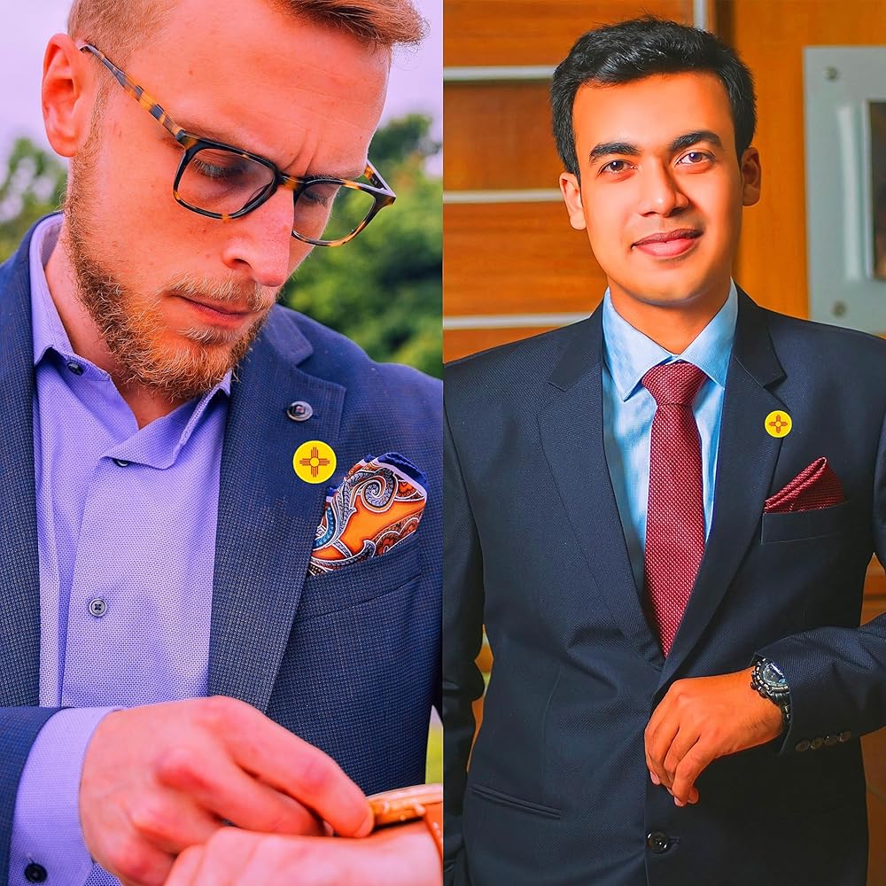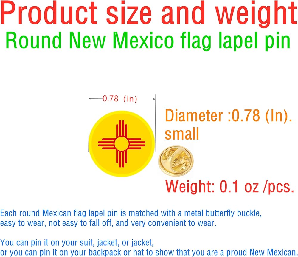 دبابيس طية صدر علم نيو مكسيكو: سوف تحصل على مجموعة من دبابيس طية صدر علم نيو مكسيكو، والتي يمكنك ارتداؤها على سترة بدلتك، أو تثبيتها على حقيبة ظهرك أو قبعتك لإظهار أنك مكسيكي فخور.