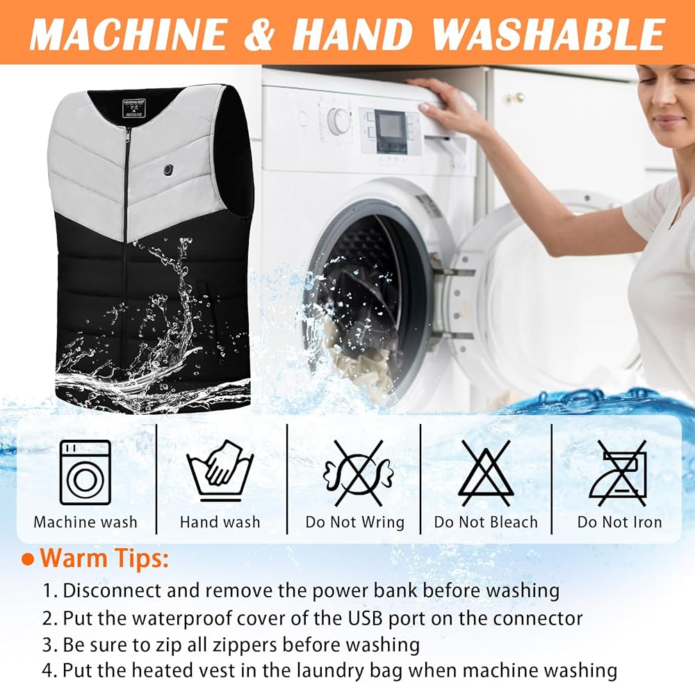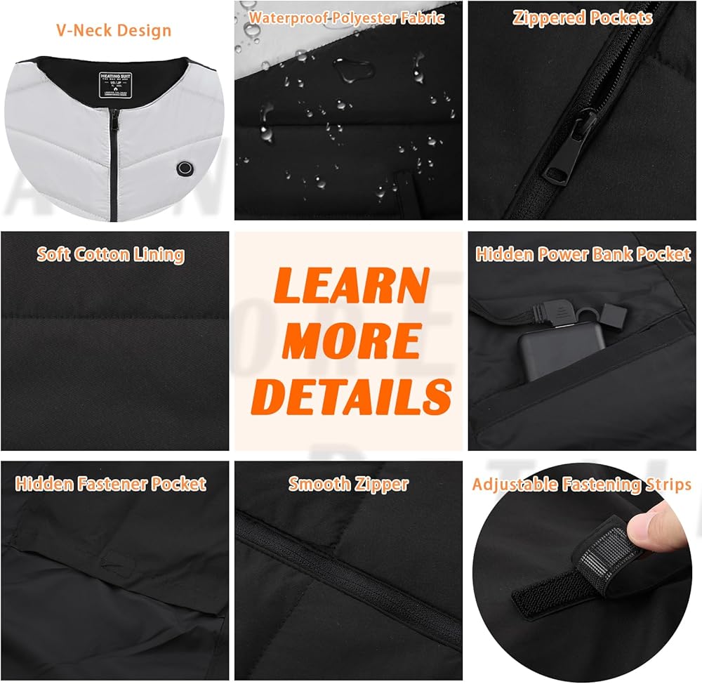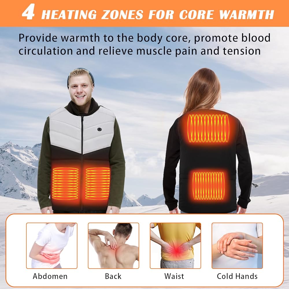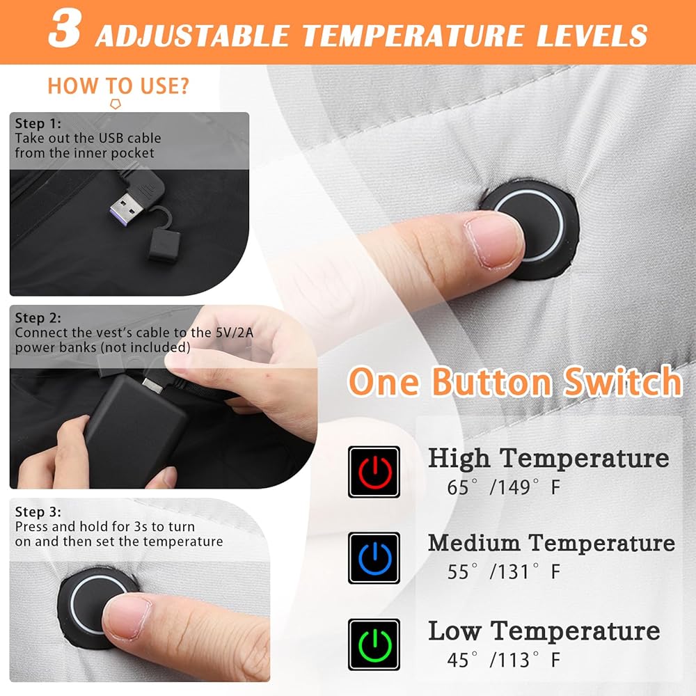 4 مناطق تسخين للتدفئة الأساسية مجهزة بـ 4 عناصر تسخين من ألياف الكربون تولد الحرارة في البطن والخصر والجزء العلوي من الظهر، وتوفر الدفء لقلب الجسم، وتعزز الدورة الدموية وتخفف آلام العضلات وتوترها. جيوب بسحاب مصممة على الجانبين الأيسر والأيمن من منطقة البطن الساخنة، حتى تتمكن من وضع يديك في الجيوب للاستمتاع بالدفء. كيبل USB مدمج، متوافق مع معظم باور بانك 5 فولت/2 امبير (غير متضمن).