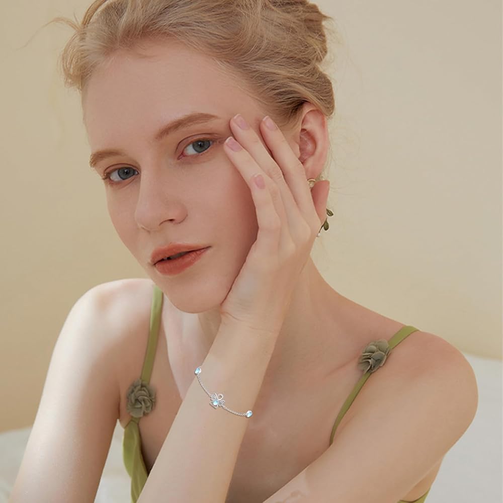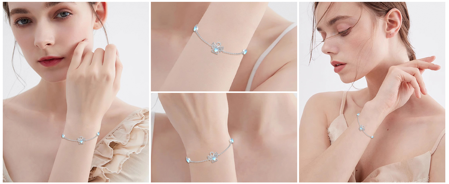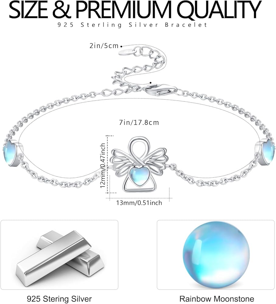 【أساور حجر القمر للنساء المقاس】المقاس: 13 × 12 ملم (0.51 × 0.47 انش)، وزن الفضة الإسترلينية: 2.8 غرام. (صغيرة وخفيفة الوزن للارتداء اليومي والليل). سلسلة قابلة للتعديل بطول 7 + 2 انش يمكن أن تلبي احتياجات معظم الأشخاص. سوار الملاك الحارس من حجر القمر خفيف الوزن ومريح جدًا في الارتداء، ومناسب لمختلف المناسبات مثل الحفلات والمدارس والمكاتب وأكثر من ذلك. بالإضافة إلى ذلك، يمكن مطابقتها مع العديد من الملابس مثل الأنماط اليومية والجميلة واللطيفة وغيرها من الأنماط