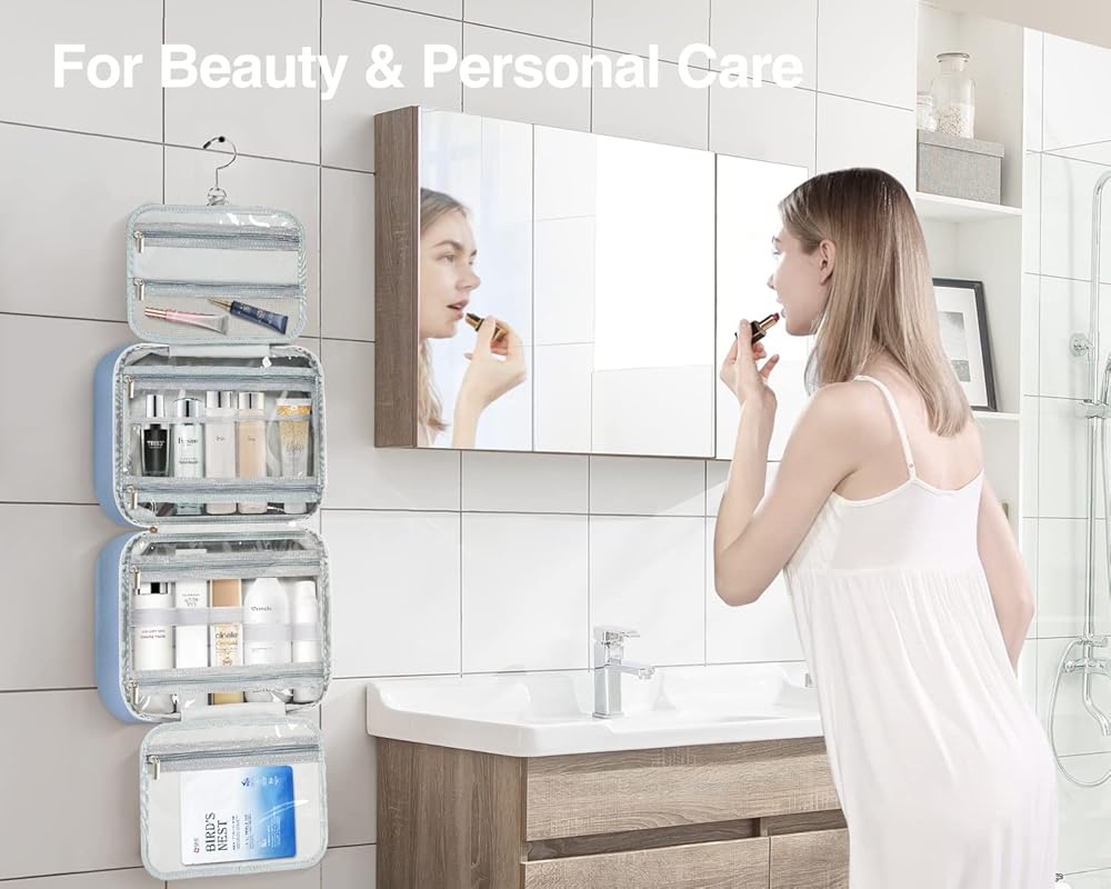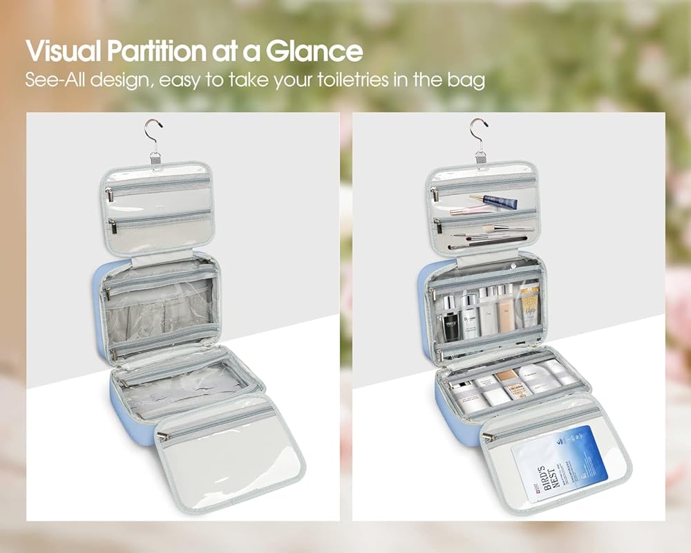 تصميم داخلي ذكي: ستحافظ المقصورات الرئيسية الداخلية على مستحضرات التجميل وأدوات النظافة في مكانها من أجل الأشرطة المرنة التي تحمل الزجاجات في وضع مستقيم؛ مع خطاف معدني قابل للدوران 360 درجة، يمكنك تعليقه أو إزالة العناصر حسب الحاجة، وهو مريح للغاية للوصول إلى العناصر وتوفير المساحة كحقيبة أدوات الزينة المعلقة.