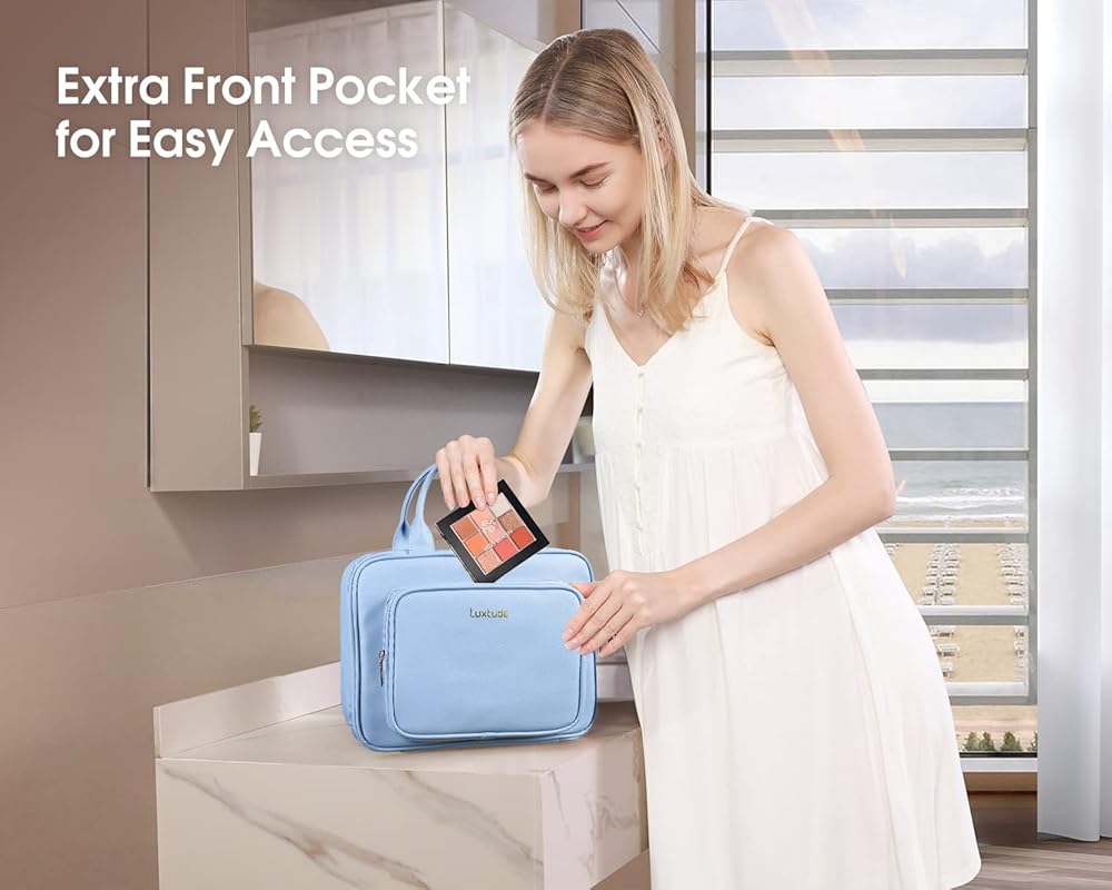 سعة واسعة: 11.5 × 4.5 × 9 بوصة (ملفوفة)، 12.5 × 35 بوصة (مفتوحة). يمكن لحقيبة أدوات الزينة الكبيرة أن تحمل جميع مستلزمات الزينة الأساسية الخاصة بك مع مساحات كافية، ويمكن ملؤها بسهولة بفرشاة أسنان كاملة الحجم ومعجون أسنان بحجم السفر والمكياج وزجاجات بحجم السفر. مع جيب خارجي كبير، يمكنك حمل أشياء إضافية لسهولة الوصول إليها عندما تكون حقيبة أدوات الزينة المخصصة للسفر مغلقة.