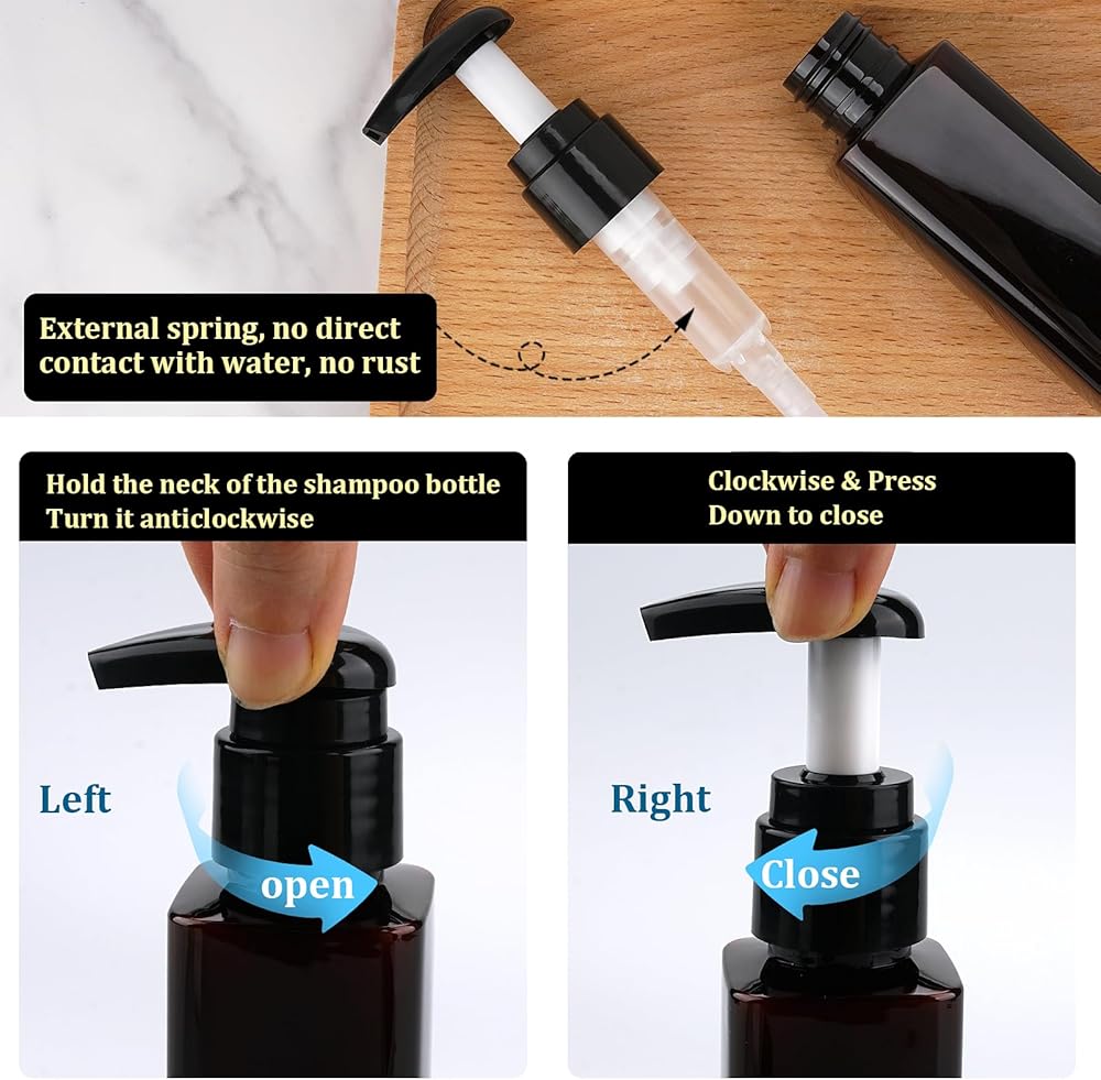【قابلة للحمل ومضادة للتسرب】عندما تقوم بتعبئة زجاجات بحجم السفر للسفر أو الشاطئ أو حمام السباحة، اضغط لأسفل ولفها في اتجاه عقارب الساعة للإغلاق، مما يمنع اللوشن من التسرب. قم بلفها عكس اتجاه عقارب الساعة للفتح والاستخدام.