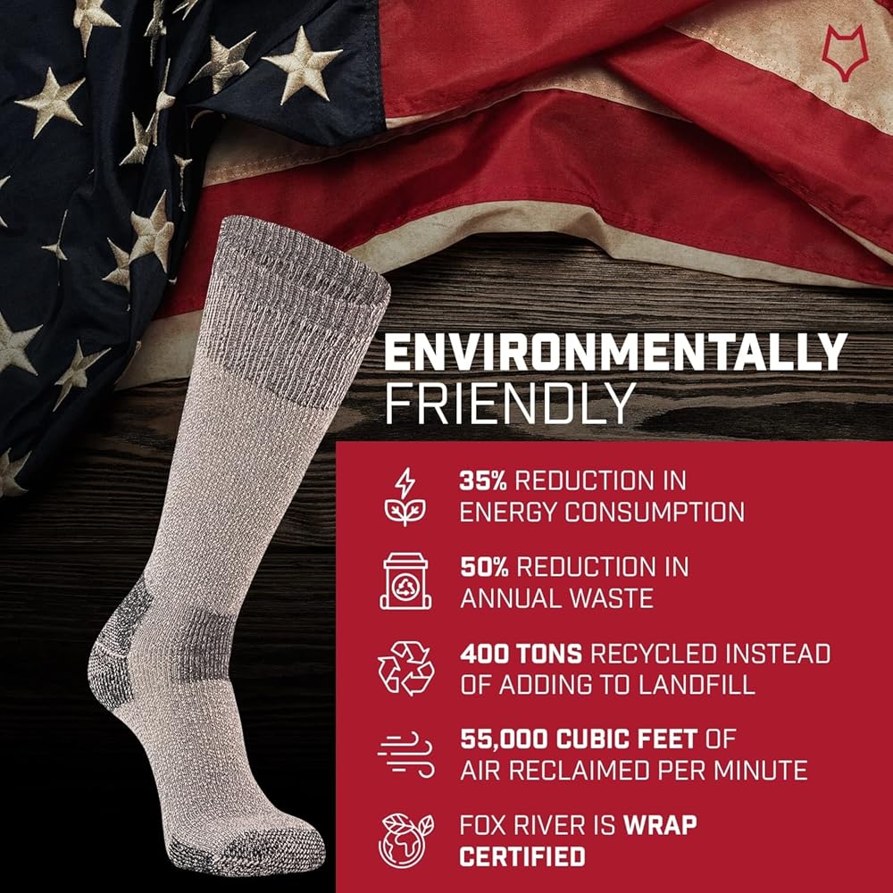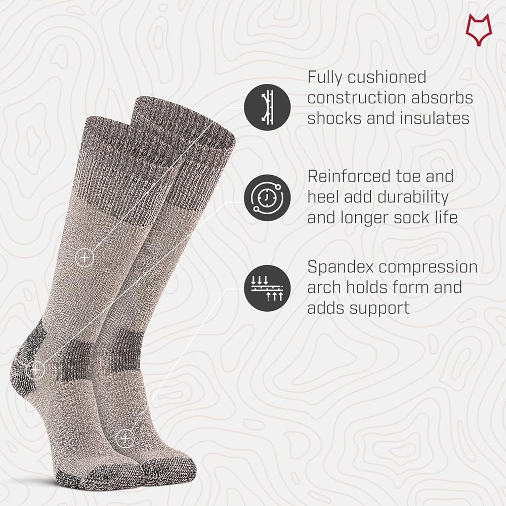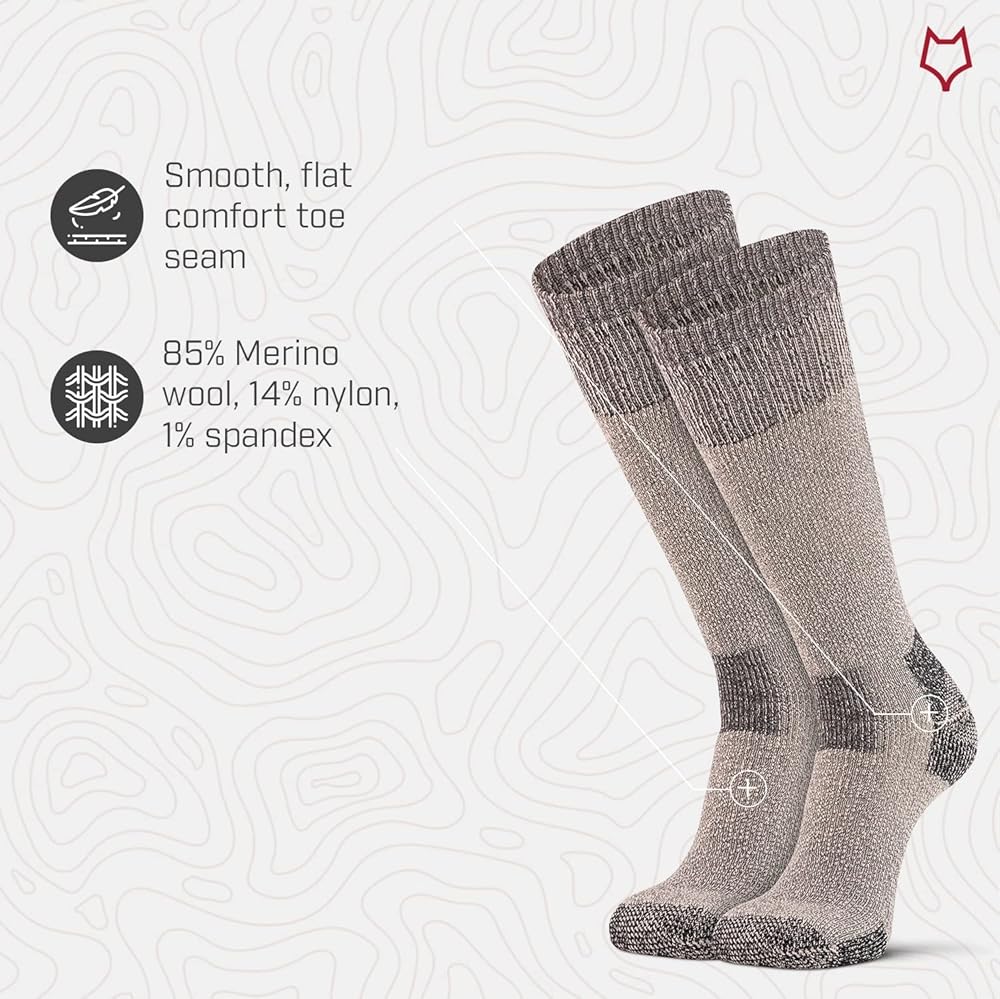 Premium Merino Wool Boot Sock. No matter your frigid activity, these FoxSox will keep your toes toasty and feet free from the freezing temps outside. Mid-calf boot height and extra-heavyweight wool with a foot-hugging fit keep your feet dry and warm.