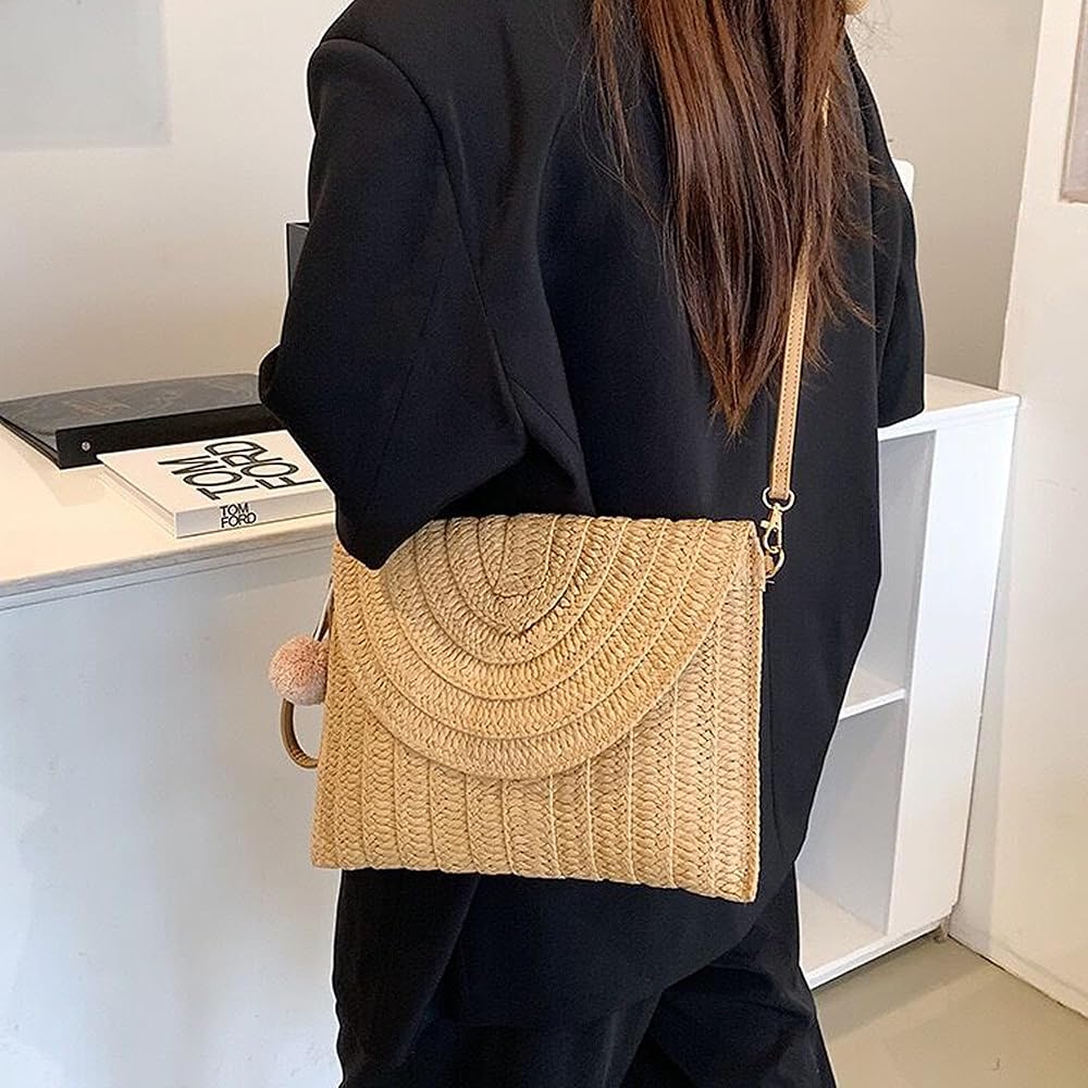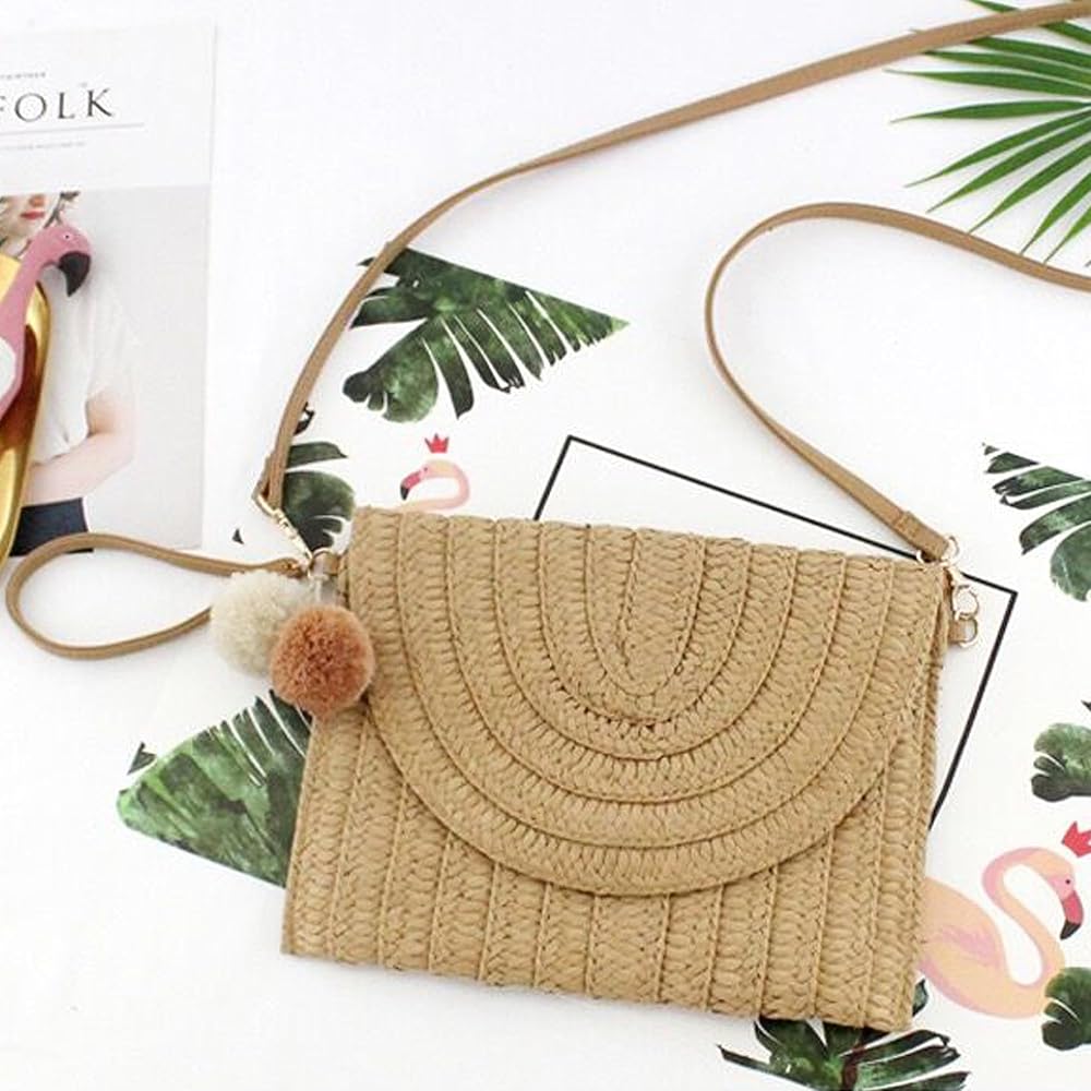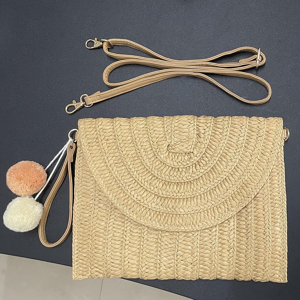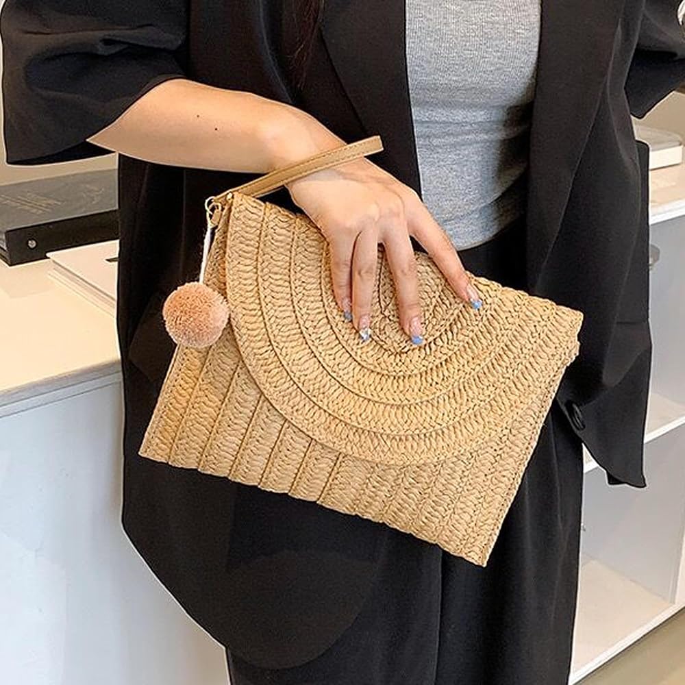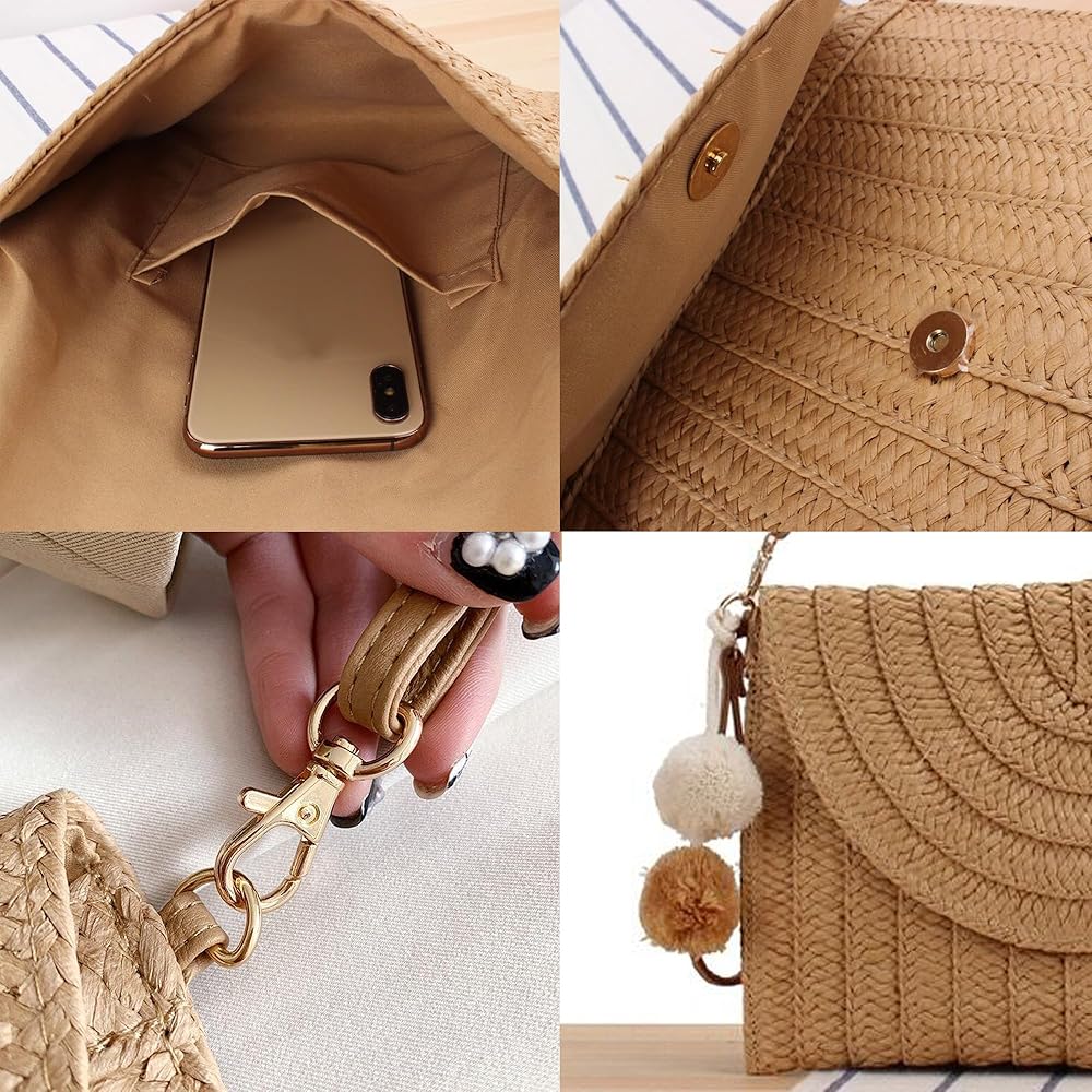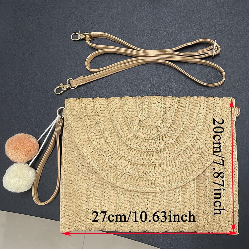 حقيبة مغلف من القشة: تقريبًا 27×20 سم/10.63×7.87 انش (الطول × العرض). كبيرة بما يكفي للحفاظ على الجوال ومستحضرات التجميل والمفاتيح وما إلى ذلك.