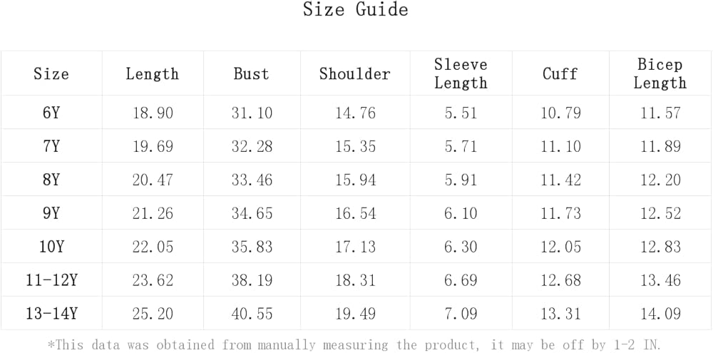 11-12Y:Bicep Length:13.5IN,Bust:38.2IN,Cuff:12.7IN,Length:23.6IN,Shoulder:18.3IN,Sleeve Length:6.7IN