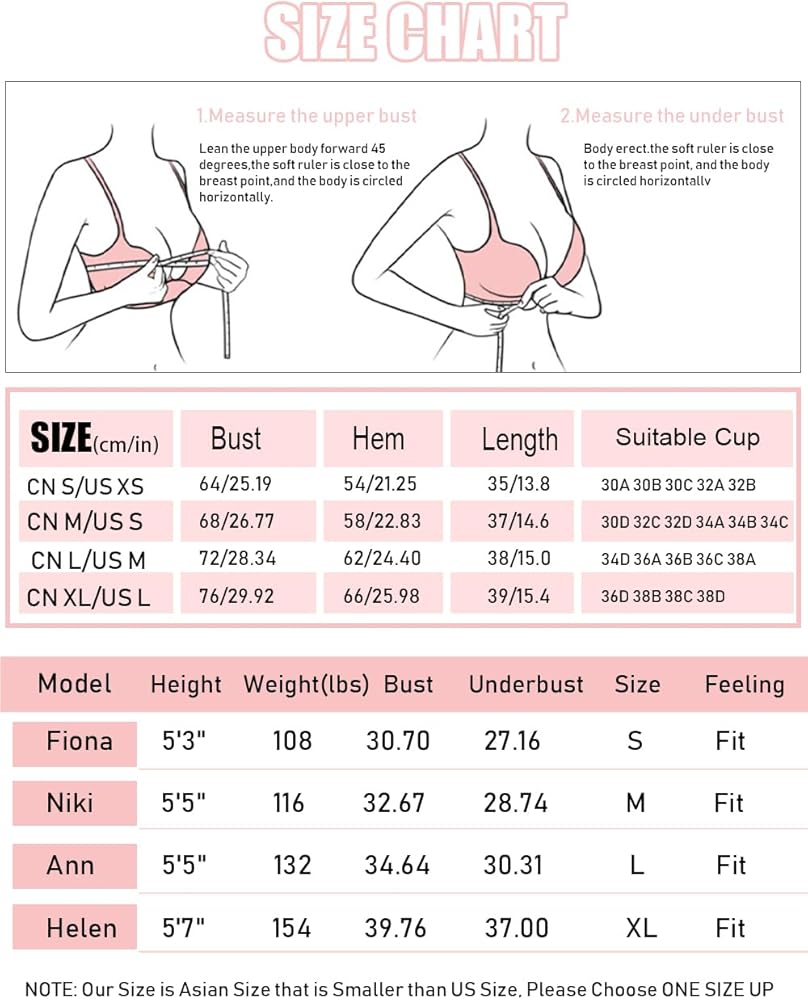 KINDLY NOTE: S fit for 30A 30B 30C 32A 32B; M fit for 30D 32C 32D 34A 34B 34C; L fit for 34D 36A 36B 36C 38A; XL fit for 36D 38B 38C 38D. When encountering the phenomenon of slipping shoulder straps, unsuitable elasticity of the lower circumference, hands up sliding, empty cup, etc., may be the reason for the size, please check the size data carefully before placing an order.
