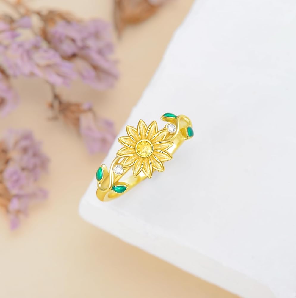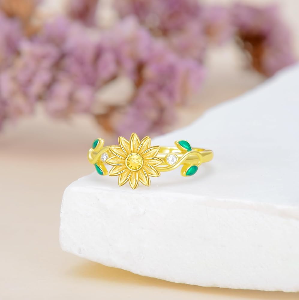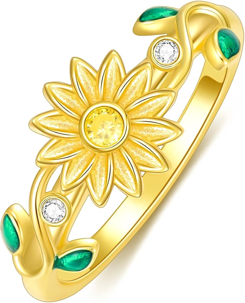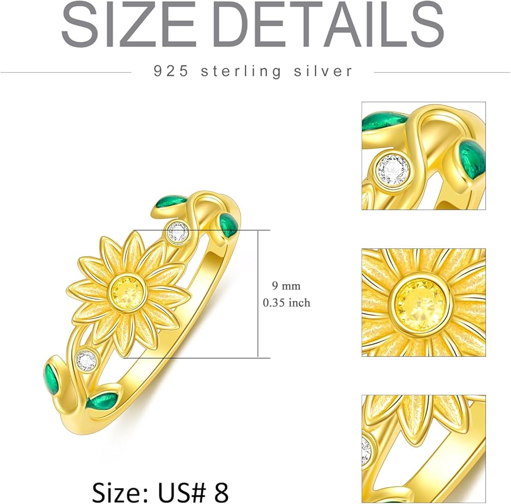❤ هدية لها ❤ خاتم عباد الشمس المطلي بالذهب من الفضة الإسترلينية هو فكرة هدية مجوهرات عباد الشمس للنساء والفتيات والزوجة والأخت والابنة والحفيدة والصديقة وأفضل صديق والأم والجدة.