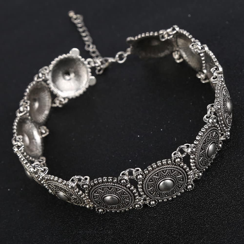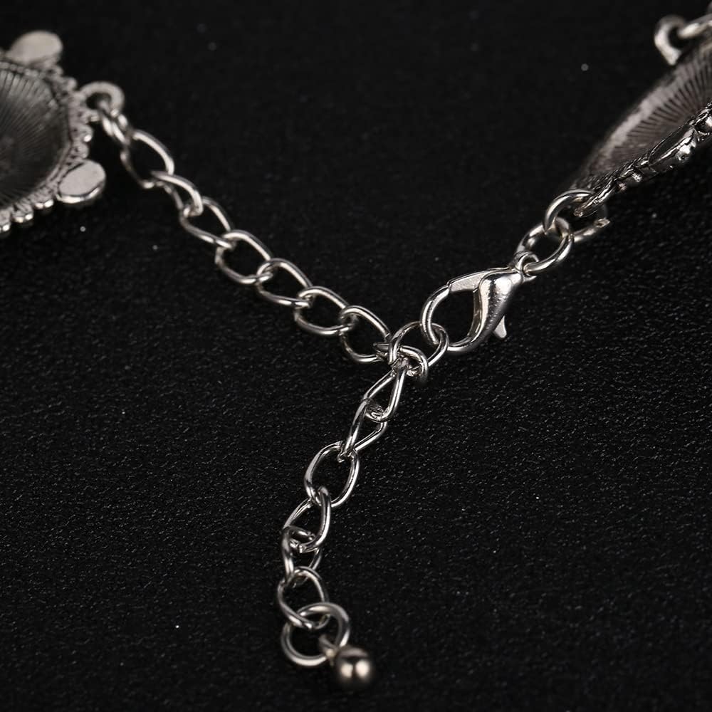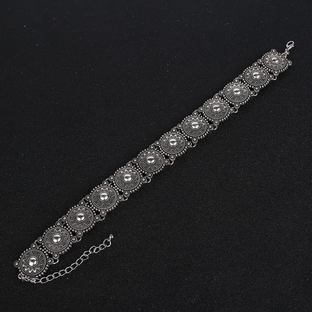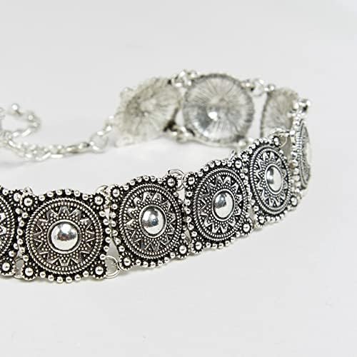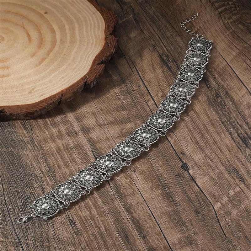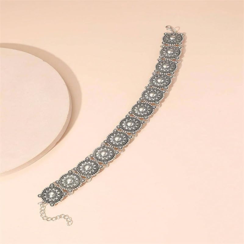 This southwestern style choker is a wonderful mix of traditional style and modern trends. With silver plated discs clad in floral motifs, this is a stunning piece.