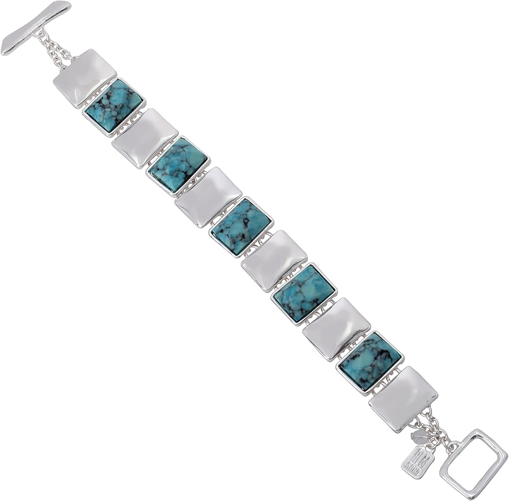 سوار بحلقات مستطيل مذهل يتميز بترصيع حجر تركواز مثالي للاستخدام اليومي. يتميز السوار بإغلاق سهل التبديل. مصنوعة من معدن مصقول وتركواز شبه ثمين.