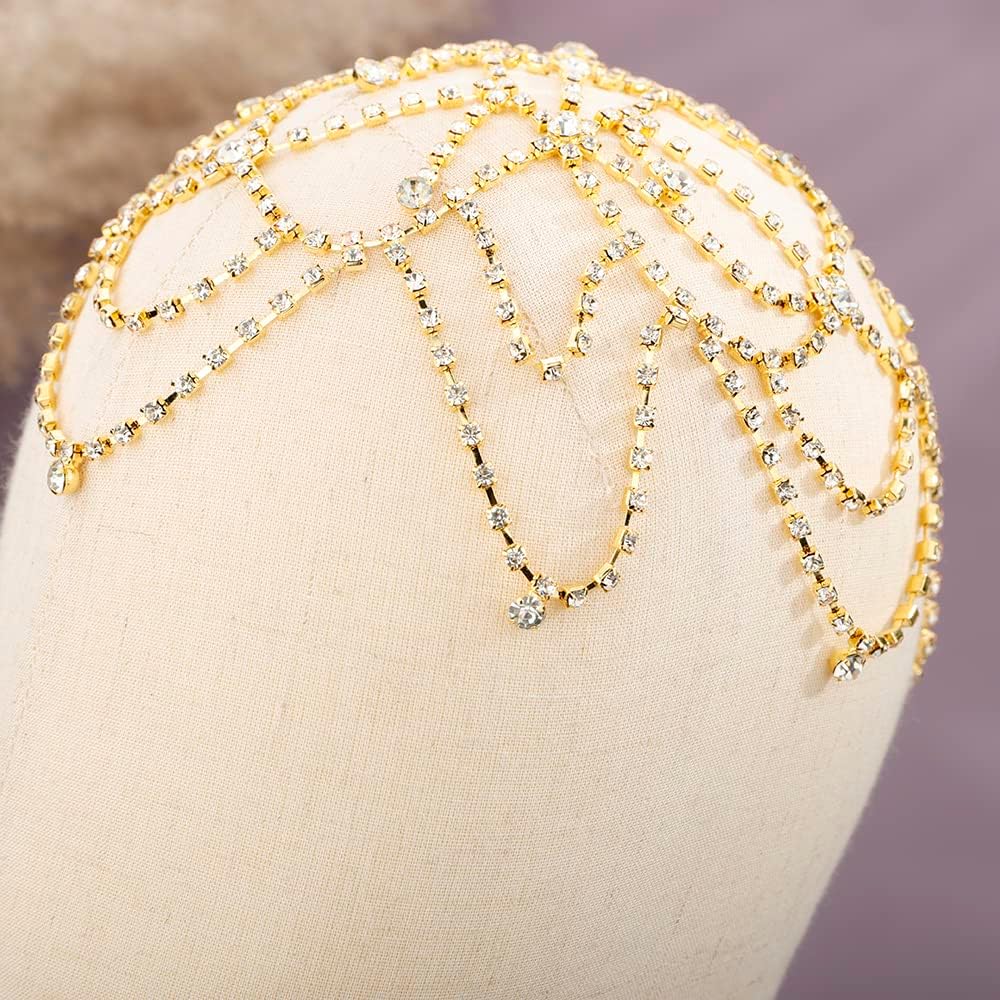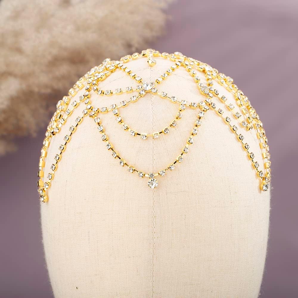 Rumtock Tassel Rhinestones Cap Headpiece Gold Forehead Piece with Crystal Beads for Women Girls Exotic Head Jewelry for Women Girls Wedding Bridal Headpiece