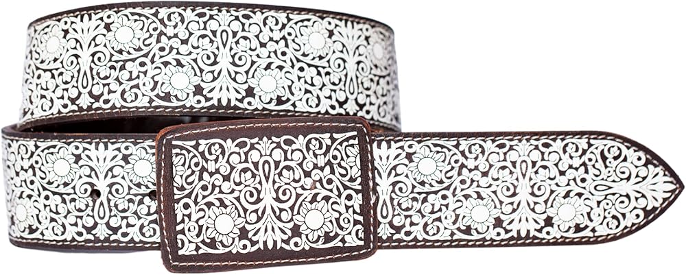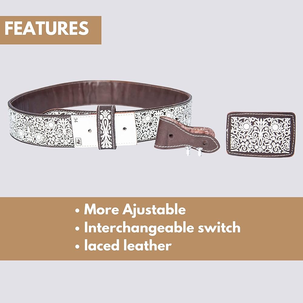 Genérico حزام جلدي للرجال زهور ورموز. سينتو شارو دي كورو لاسيادو. الألوان حزام جلد بني وأبيض.